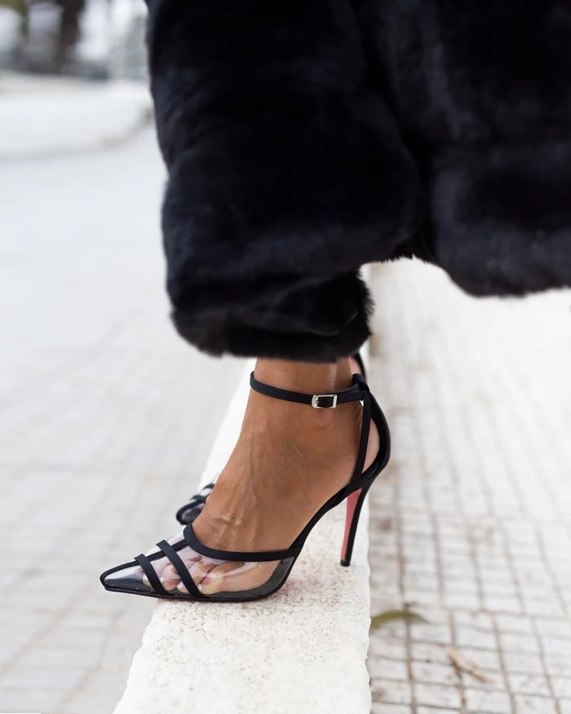 Tfp μυτερές γόβες με διαφάνεια. Είνει ανοιχτές στο πλάι και δένουν με μπαρέτα στο ύψος του αστραγάλου. Δερμάτινος πάτος. Ελληνικής κατασκευής.