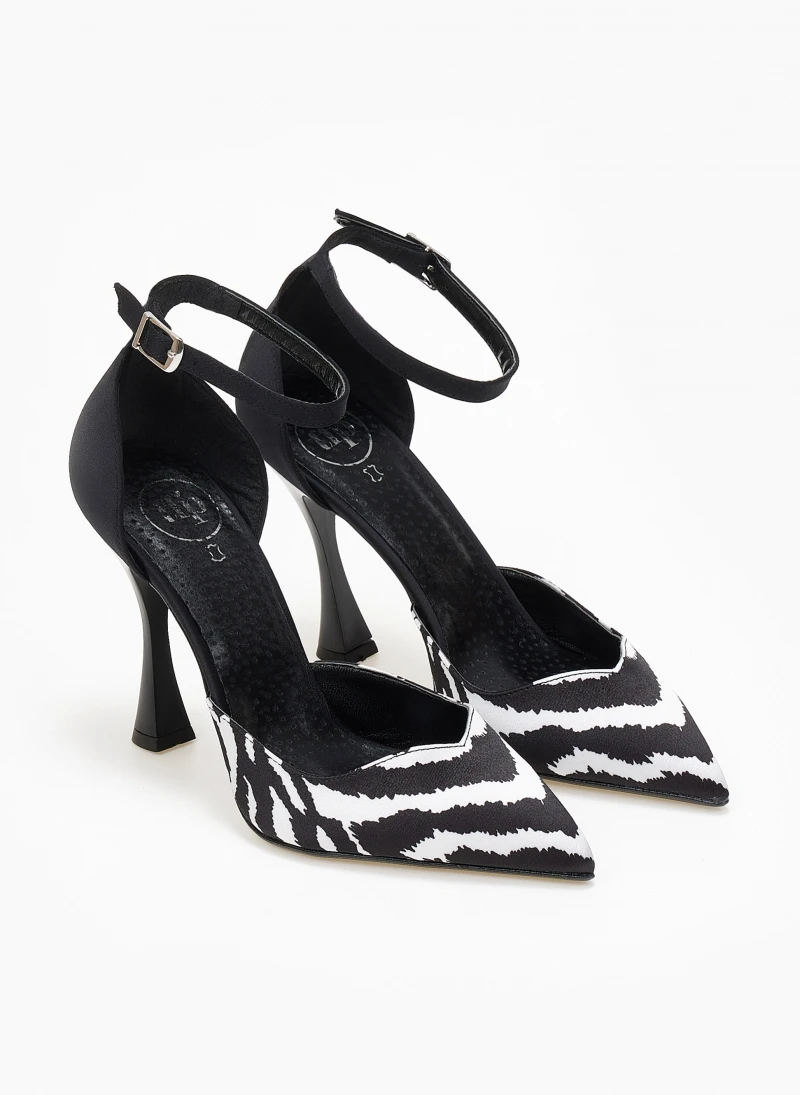 Γόβες ανοιχτές με print tfp. Έχoυν κλειστή φτέρνα. Δένουν με μπαρέτα στο ύψος του αστραγάλου. V cut σχέδιο στα δάκτυλα. Δερμάτινος πάτος. Ελληνικής κατασκευής.