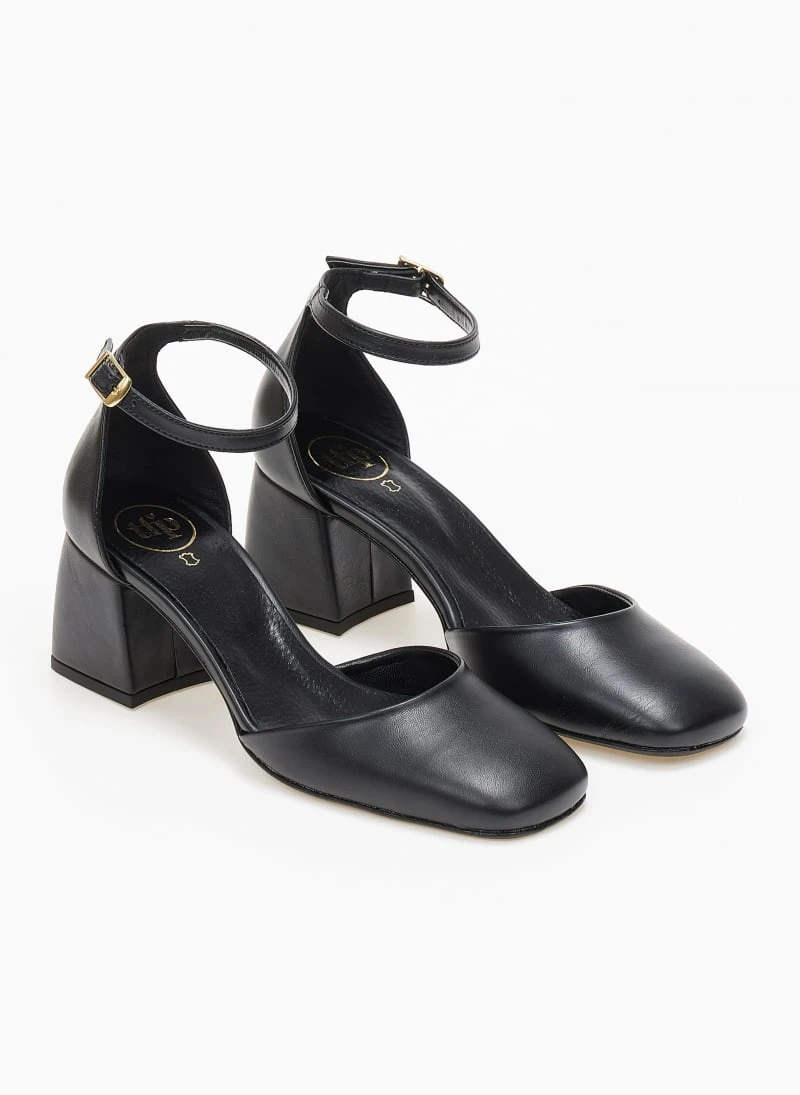 Γόβες tfp με χαμηλό τετράγωνο τακούνι. Έχουν ανοιχτά πλαϊνά. Κλειστή φτέρνα. Δένουν με μπαρέτα στο ύψος του αστραγάλου. Δερμάτινος πάτος. Ελληνικής κατασκευής.