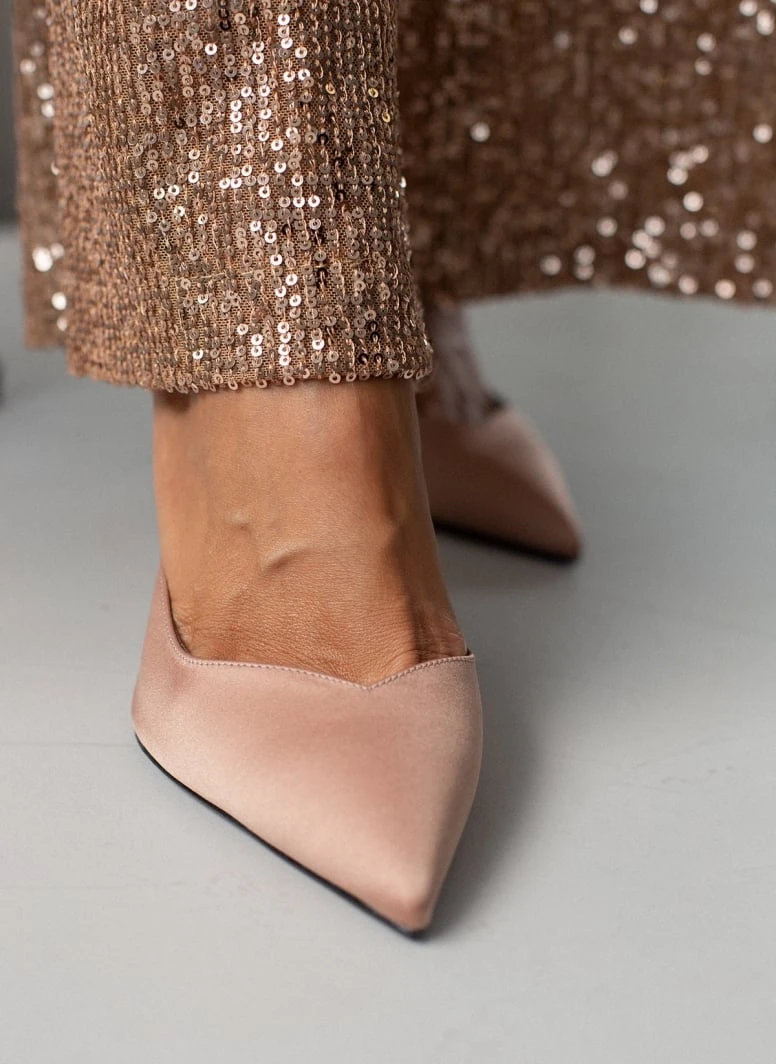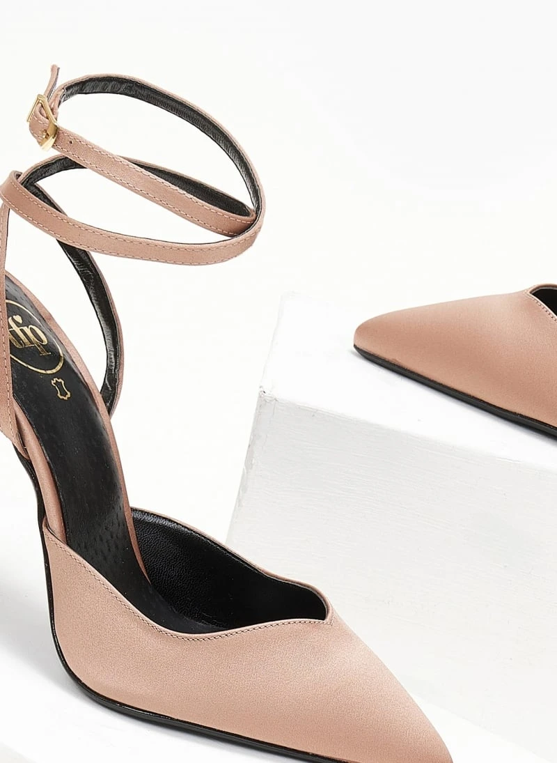 Γόβες σατέν μυτερές tfp. Δένουν με χιαστί λουράκι στο ύψος του ατσραγάλου. V cut σχέδιο στα δάκτυλα. Δερμάτινος πάτος. Ελληνικής κατασκευής.