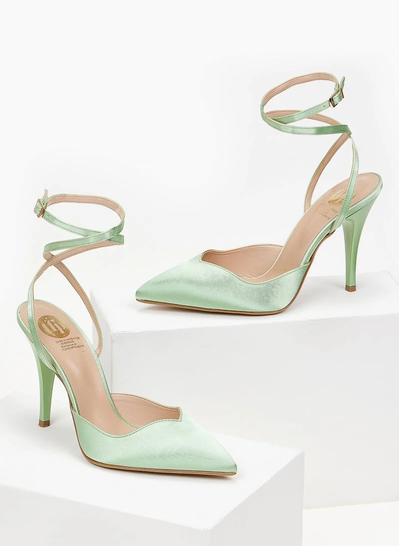 Γόβες μυτερές με ψηλό λεπτό τακούνι. Δένουν στο ύψος του αστραγάλου με χιαστί λουράκι. Δερμάτινος πάτος. Ελληνικής κατασκευής.