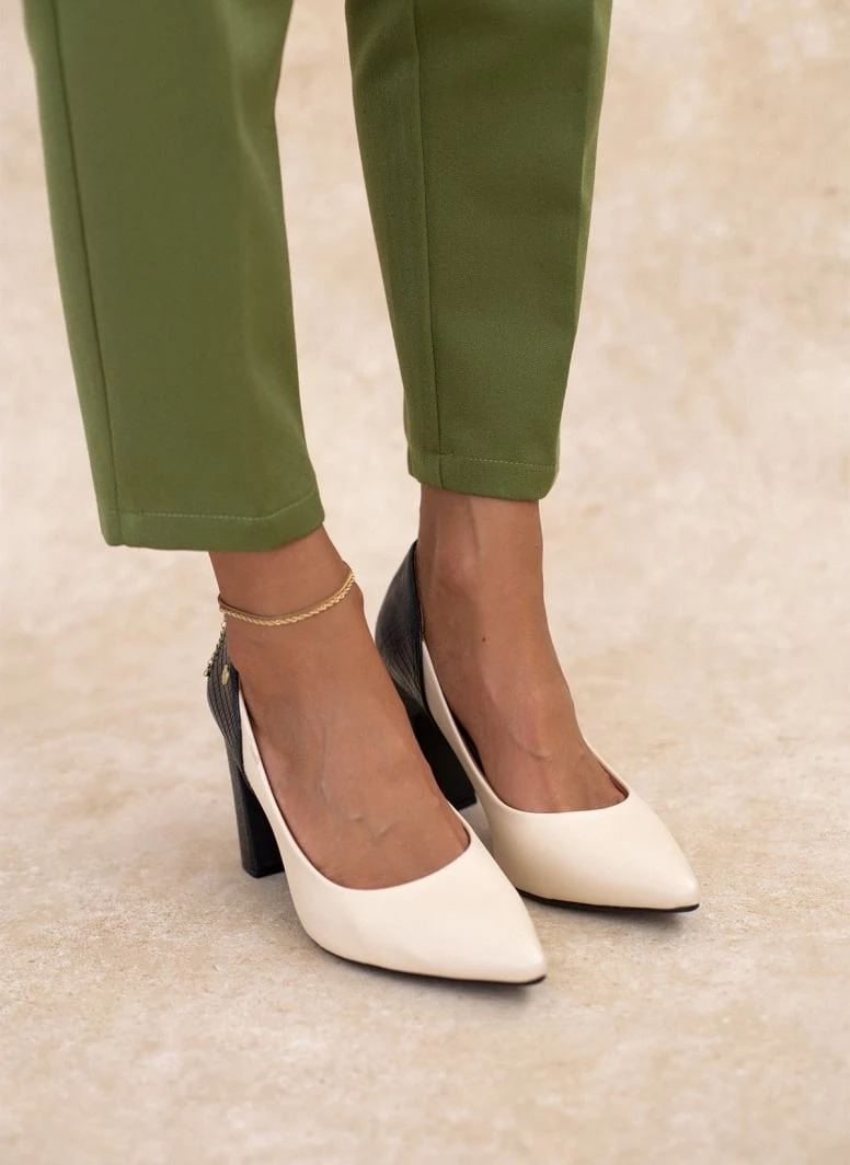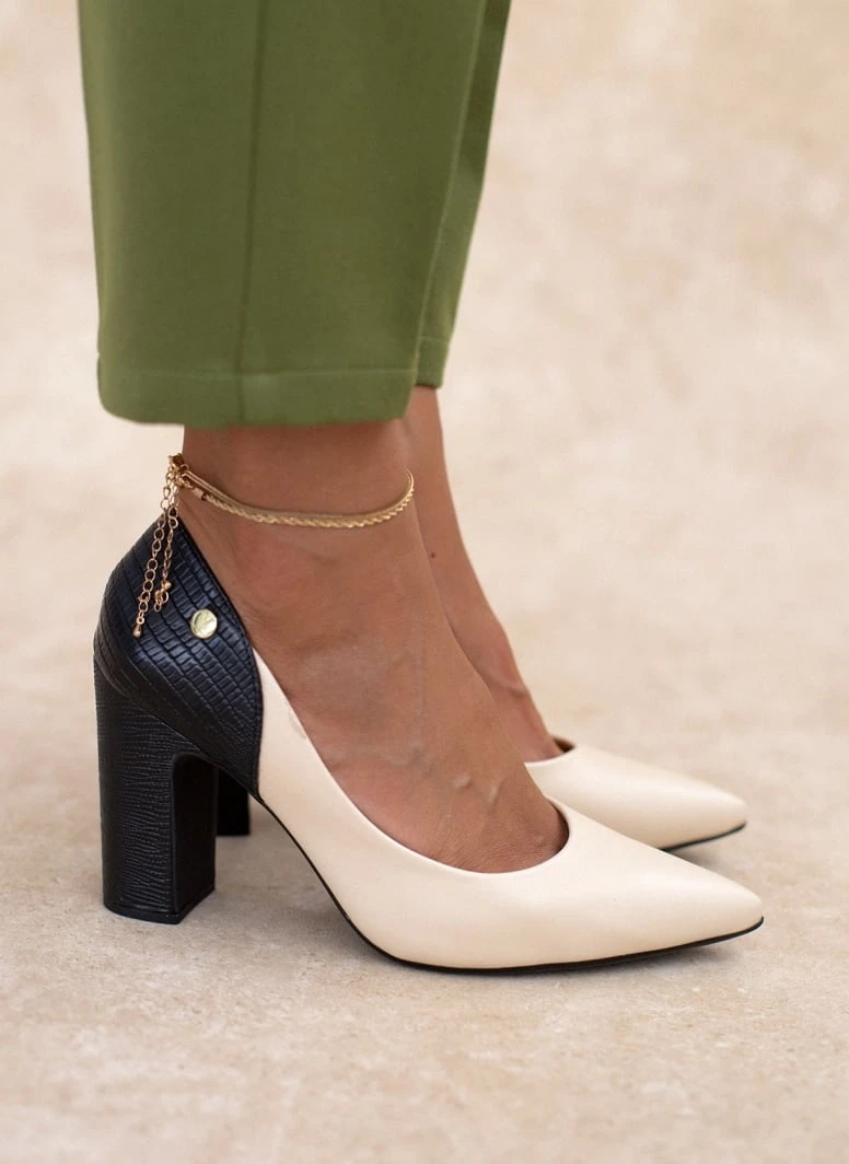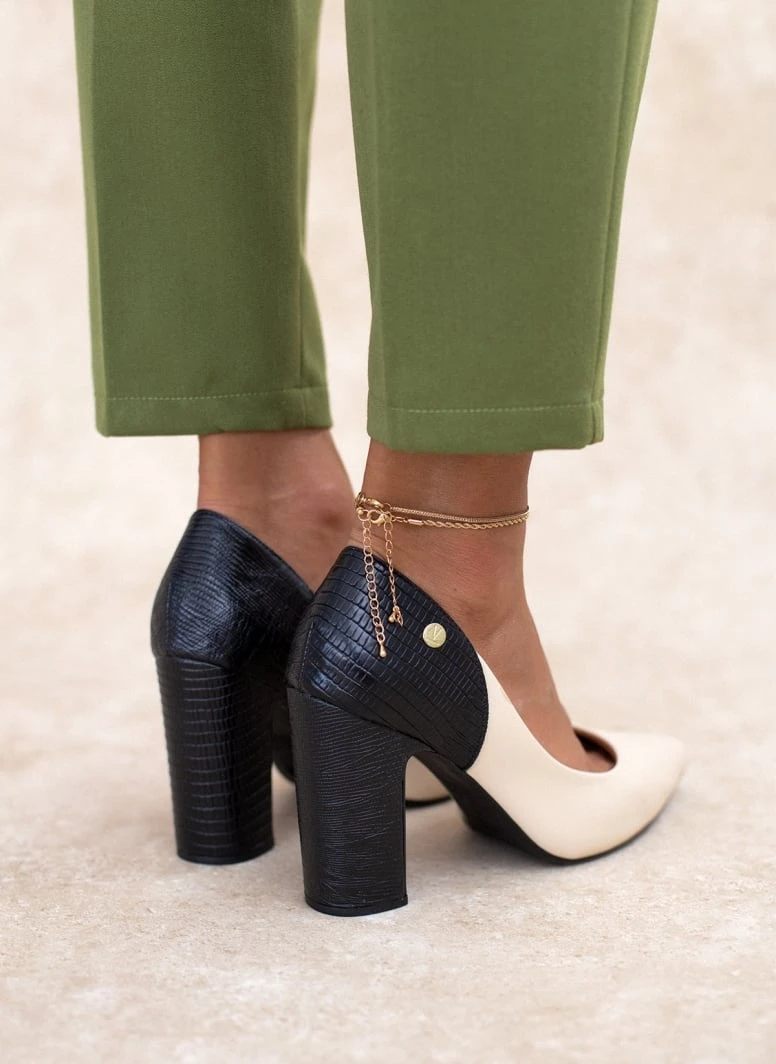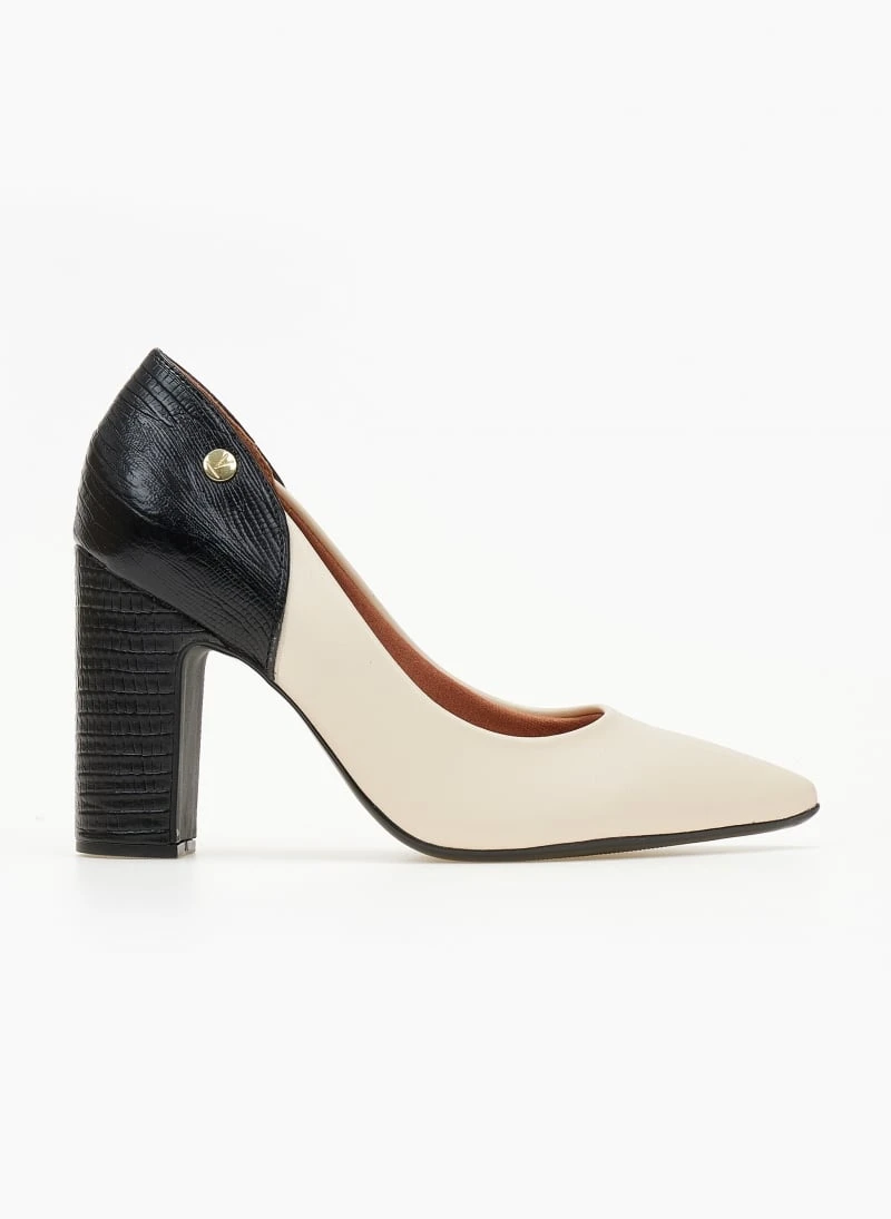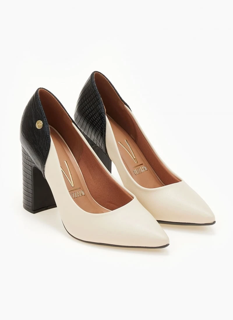 Γόβες μυτερές VIZZANO με διχρωμία. Συνδυάζουν ματ και ανάγλυφο τεχνόδερμα. Έχουν ανατομικό μαξιλαράκι στο πέλμα. Λάστιχο στη σόλα.