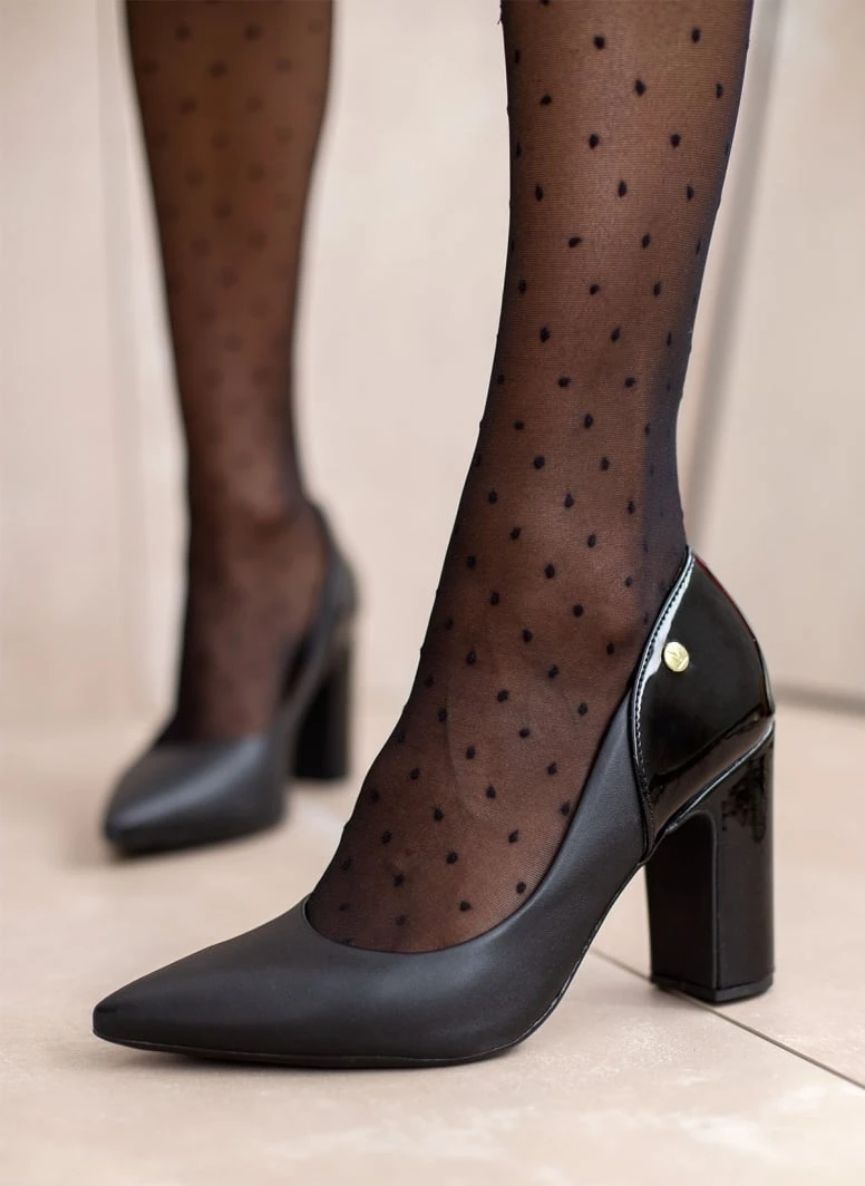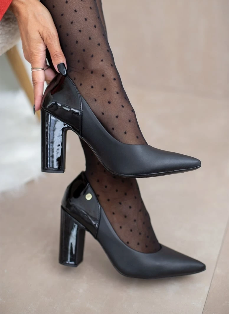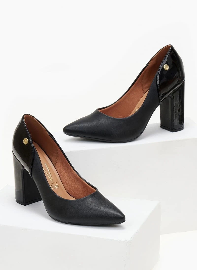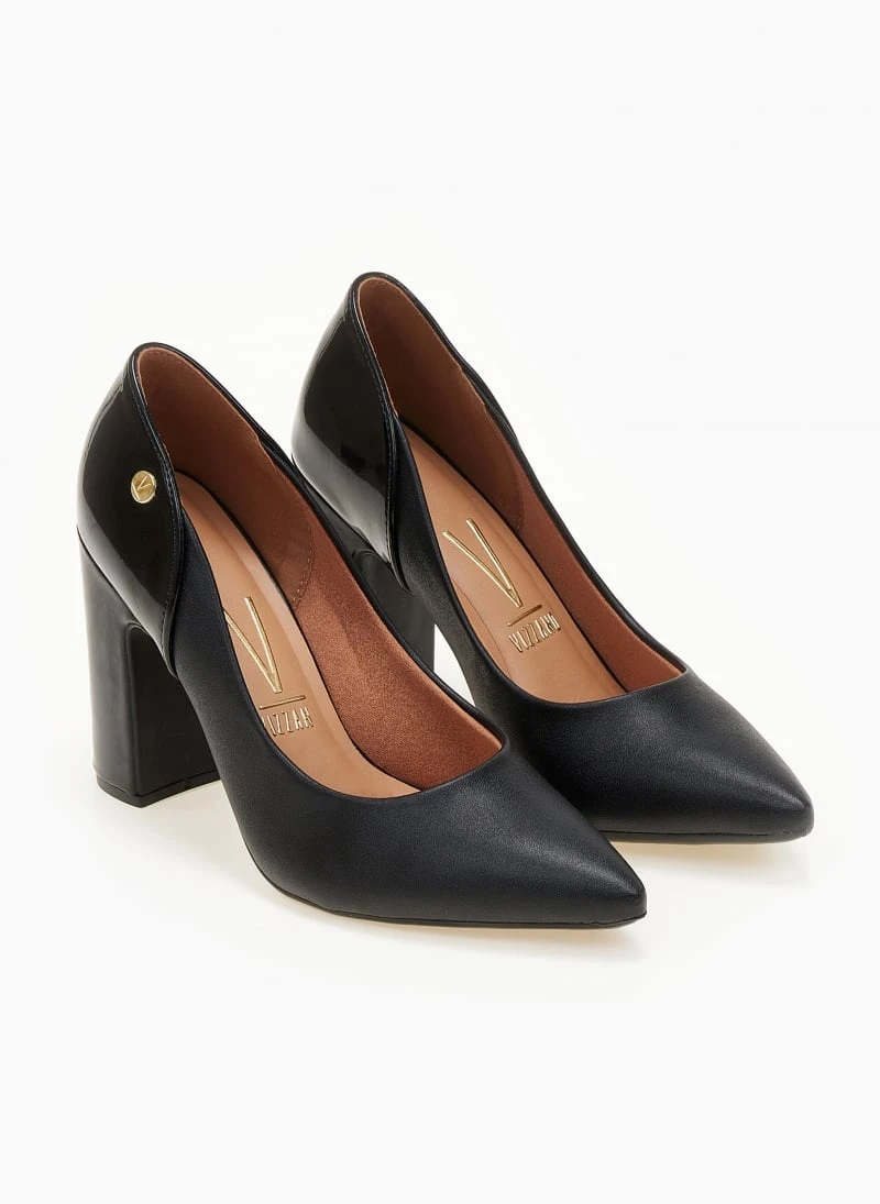 Γόβες μυτερές VIZZANO με ψηλό χοντρό τακούνι. Συνδυάζουν τεχνόδερμα και λουστρίνι. Διαθέτουν ανατομικό μαξιλαράκι στο πέλμα. Λάστιχο στη σόλα.