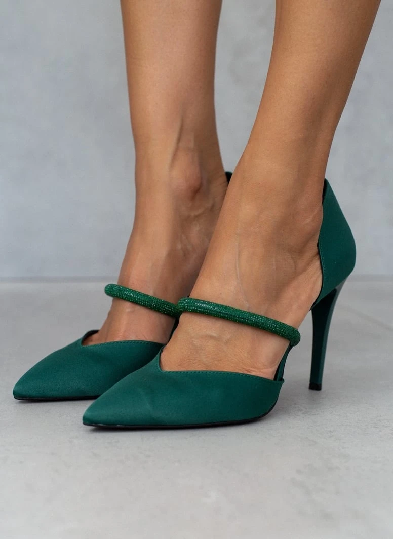 Γόβες μυτερές σατέν tfp με ανοιχτά πλαϊνά. Έχουν strass λουράκι στο ύψος του κουτεπιέ. Κλειστή φτέρνα. Σχέδιο v cut στα δάκτυλα. Ελληνικής κατασκευής.
