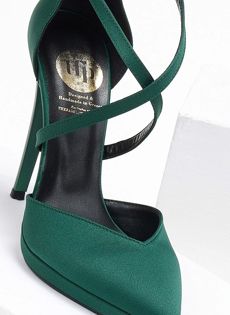 Γόβες σατέν με λεπτή φιάπα και ανοιχτά πλαϊνά tfp exclusive. Έχουν χιαστί δέσιμο στο ύψος του κουτεπιέ. Μυτερή φόρμα με v cut άνοιγμα. Η φτέρνα είναι κλειστή. Ελληνικής κατασκευής.
