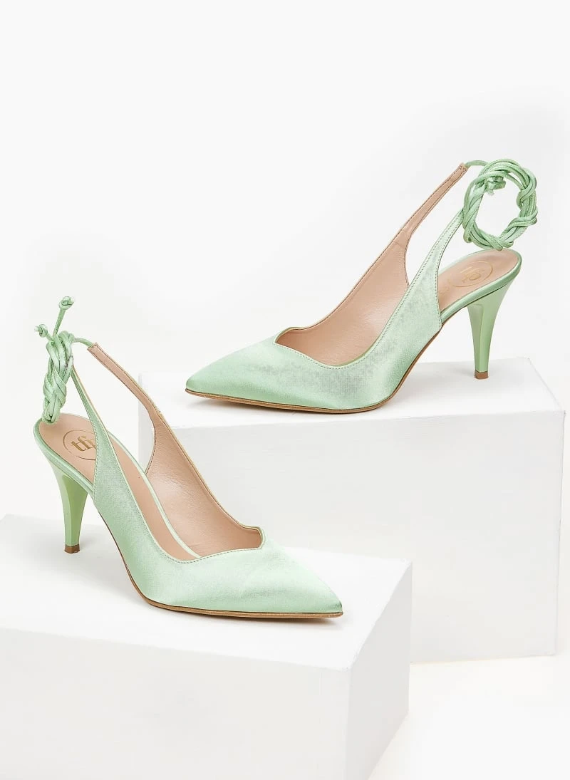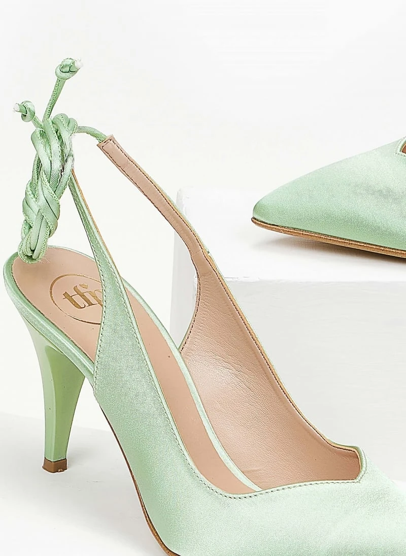 TFP σατέν γόβες με λεπτό τακούνι.Είναι ανοιχτές στο πίσω μέρος.Δένουν με κορδόνια στη γάμπα.Ελληνικής κατασκευής.