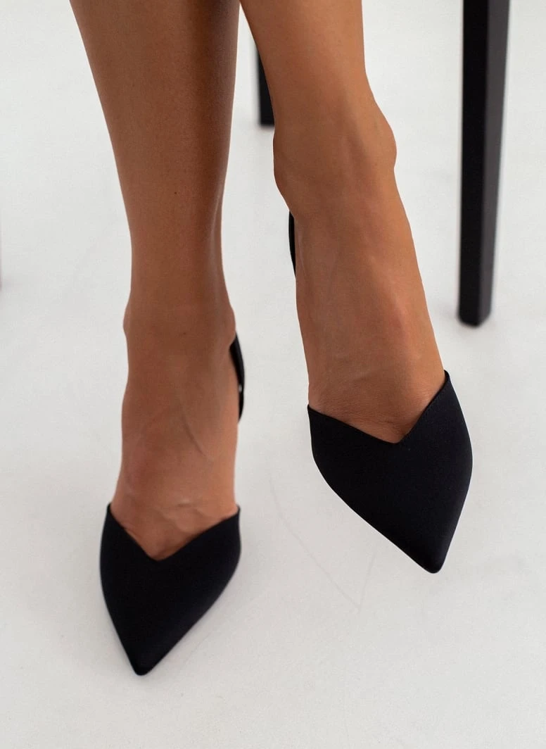 Γόβες σατέν μυτερέςtfp . Έχουν ανοιχτή φτέρνα με λουράκι. V cut σχέδιο στα δάκτυλα. Ελληνικής κατασκευής.