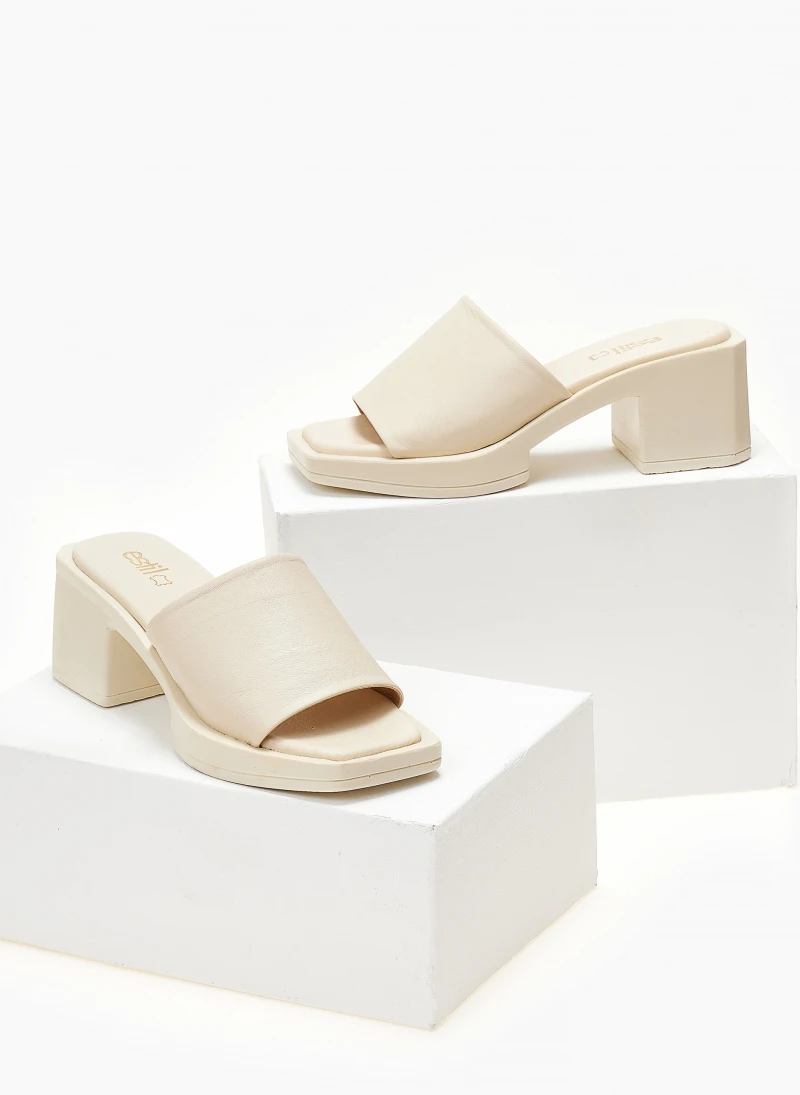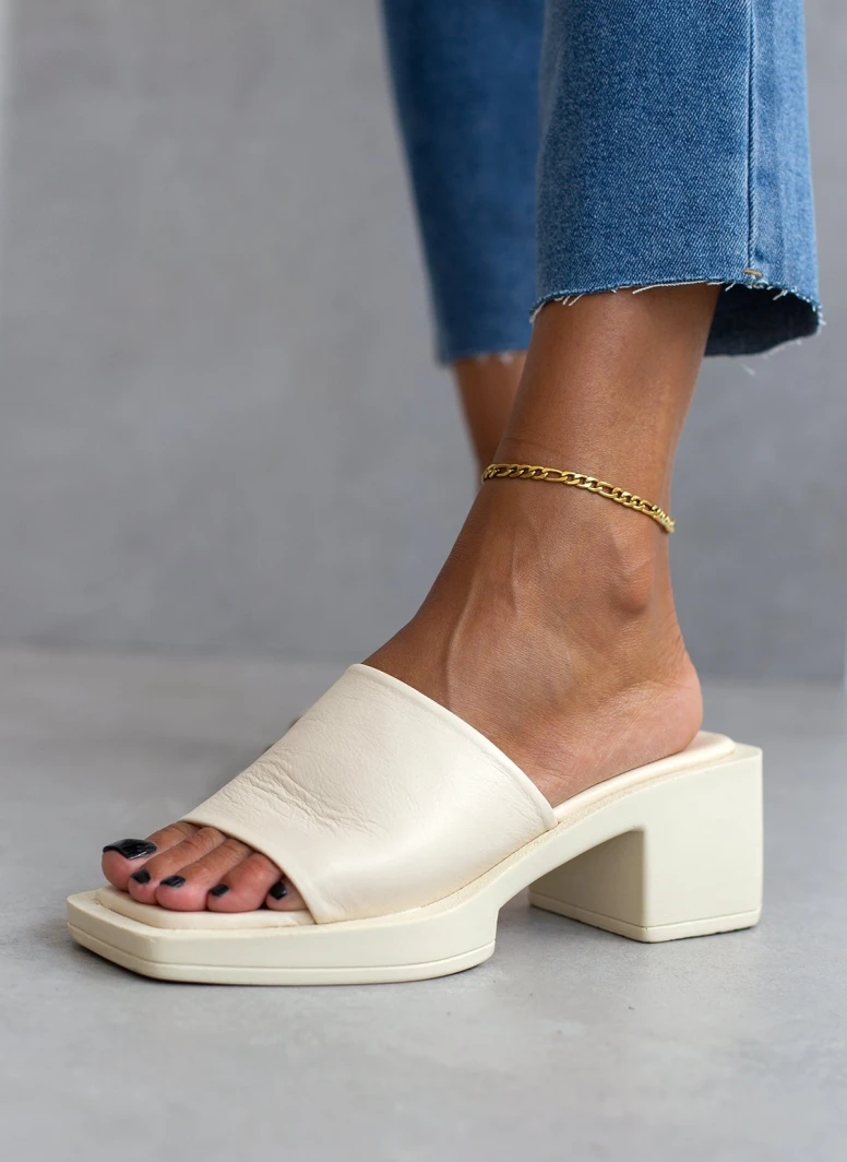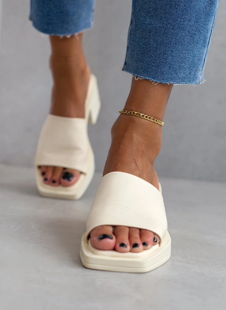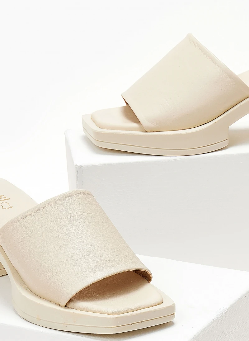 Δερμάτινα mules estil με φαρδιά φάσα. Έχουν χαμηλό τετράγωνο τακούνι. Καρέ γραμμή. Δερμάτινος πάτος με ενίσχυση. Ελληνικής κατασκευής.