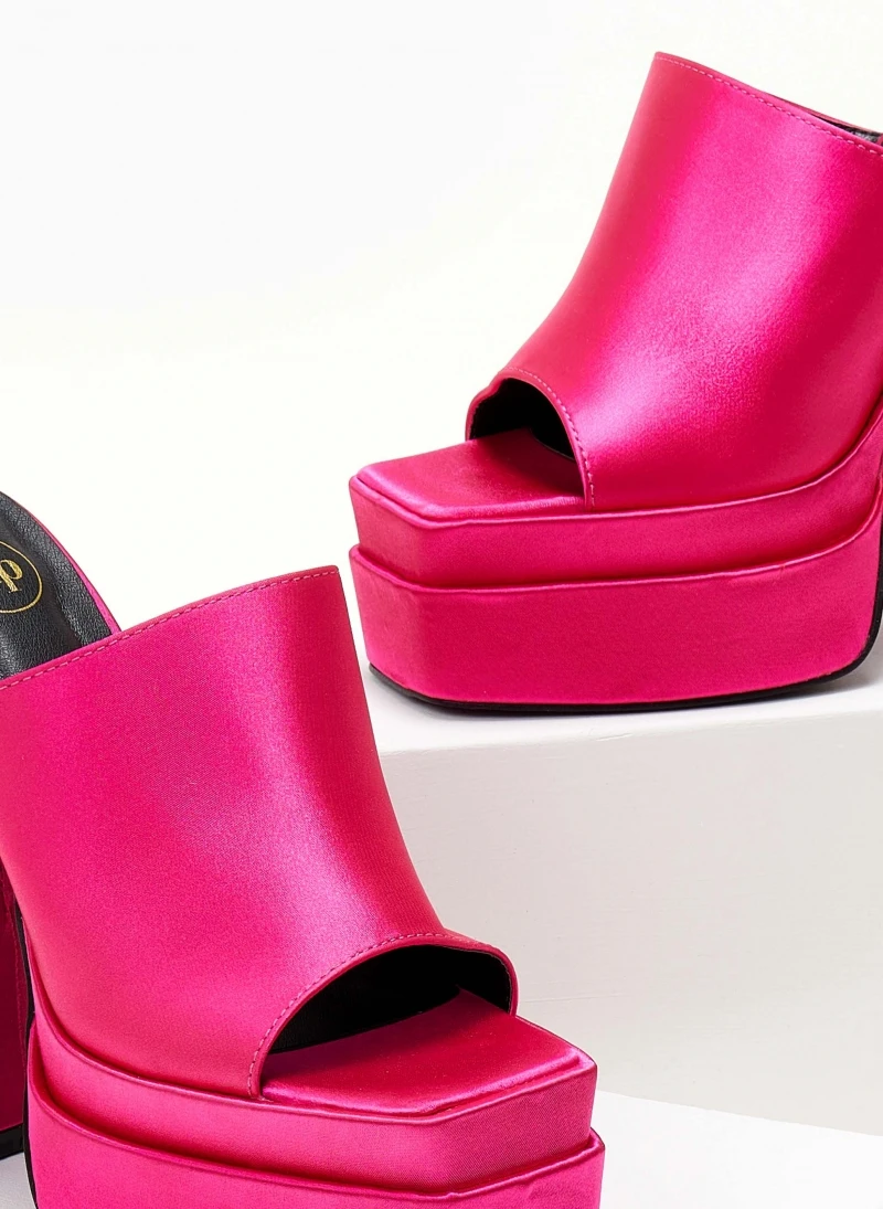 TFP Mules σατέν με platform τακούνι και ψηλή φιάπα. Έχουν φαρδιά φάσα. Καρέ γραμμή.