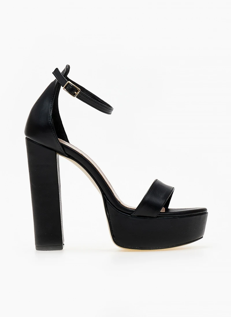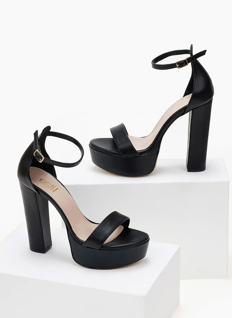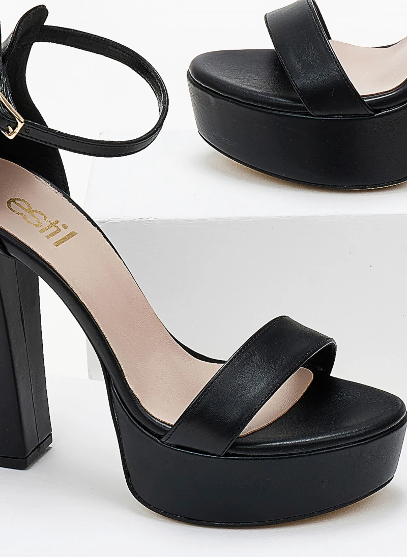 Πέδιλα Estil με φιάπα και ψηλό χοντρό τακούνι. Η φτέρνα είναι κλειστή δένουν με μπαρέτα στο ύψος του αστραγάλου. Ελληνικής κατασκευής.