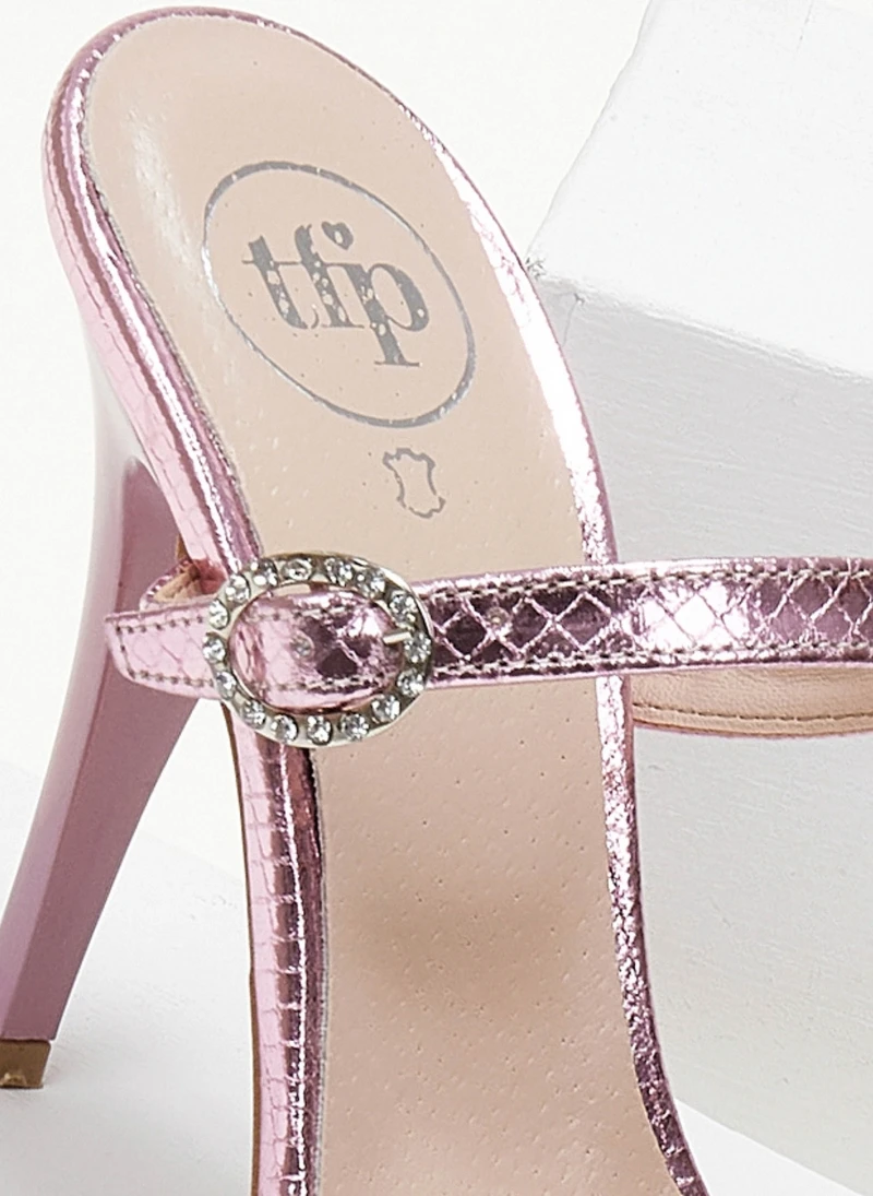 Πέδιλα TFP σε μεταλλικά χρώματα με pattern φίδι. Έχουν λεπτό ψηλό τακούνι. Καρέ γραμμή. Διακριτικό διακοσμητικό με μικρά strass στο πλάι. Δερμάτινος πάτος. Ελληνικής κατασκευής.