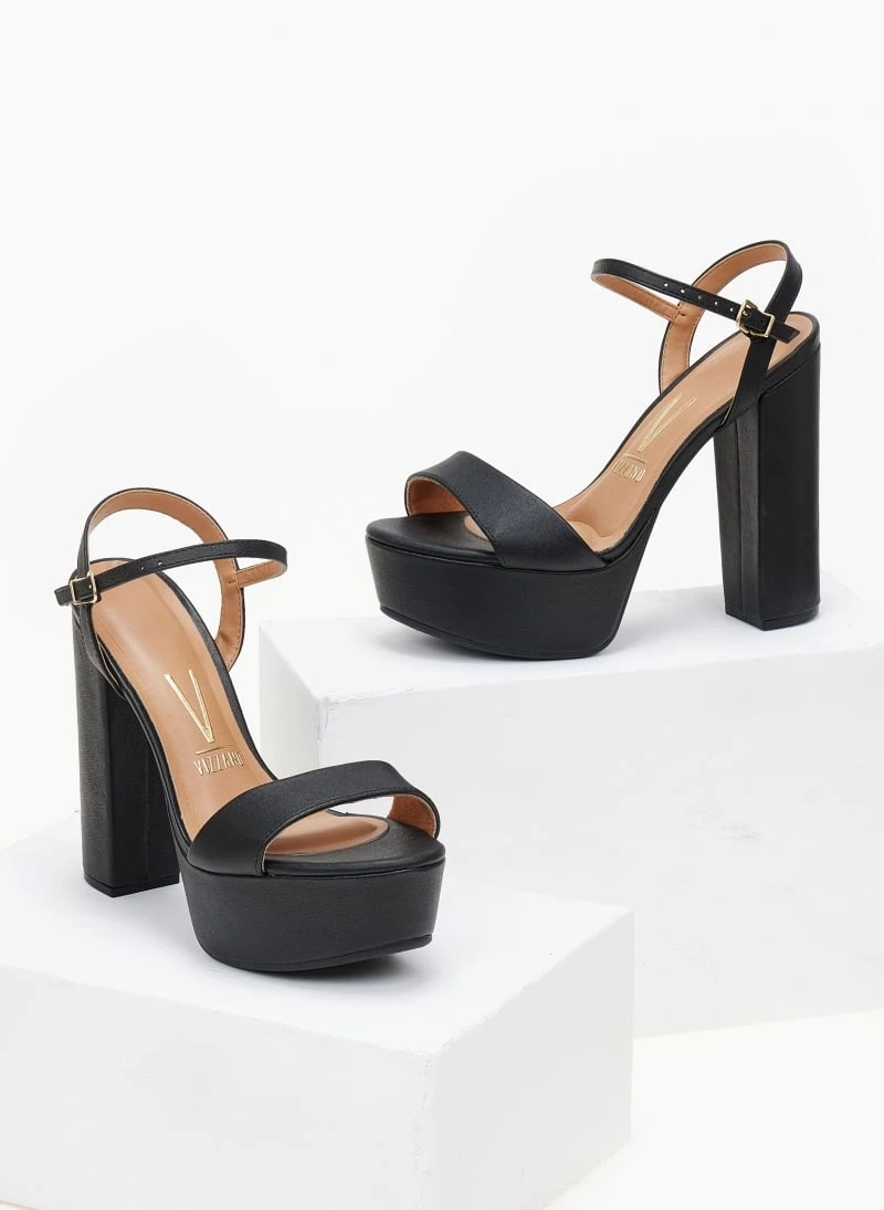 Πέδιλα VIZZANO με ψηλό τακούνι και φιάπα. Έχουν ανατομικό μαξιλαράκι στο πέλμα. λάστιχο στη σόλα. Δένουν με μπαρέτα στο ύψος του κουτεπιέ.