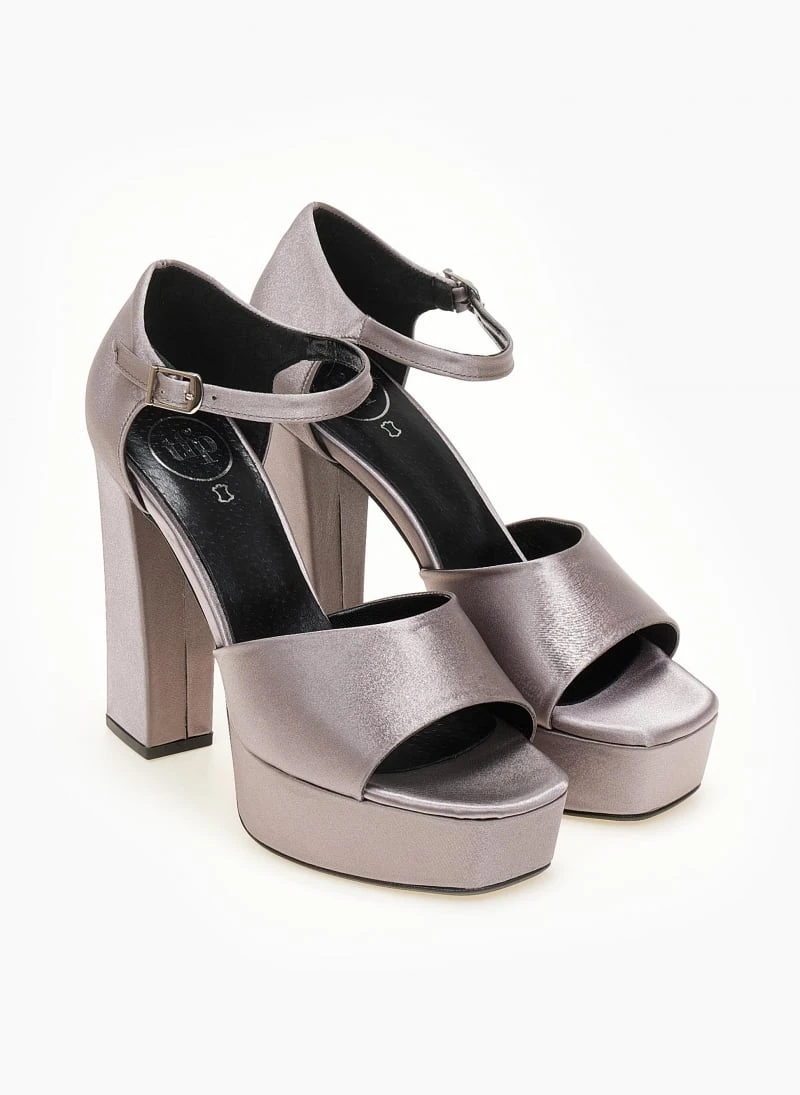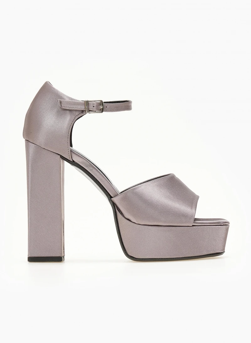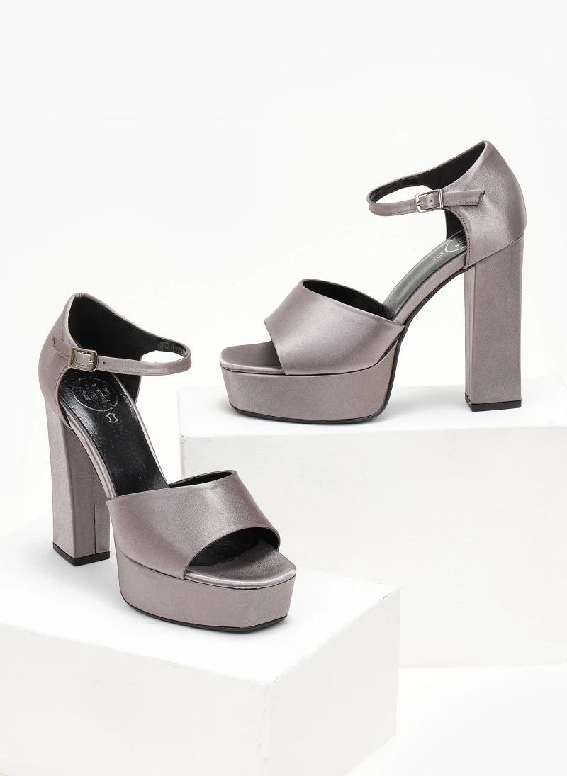 Πέδιλα TFP σατέν. Έχουν κλειστή φτέρνα. Δένουν με μπαρέτα στο ύψος του αστραγάλου. Ψηλό χοντρό τακούνι με ψηλή φιάπα. Δερμάτινος πάτος. Ελληνικής κατασκευής.
