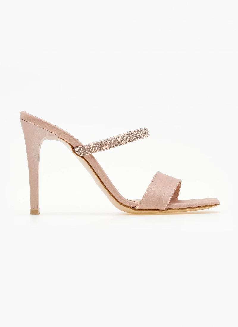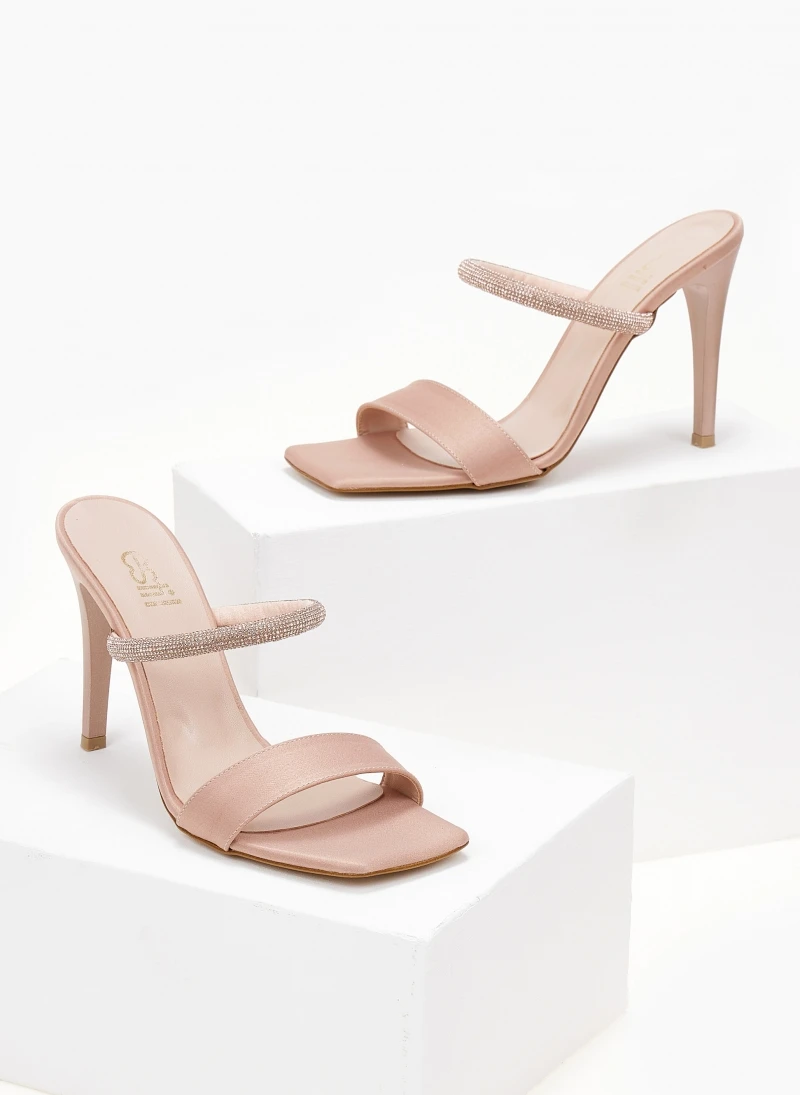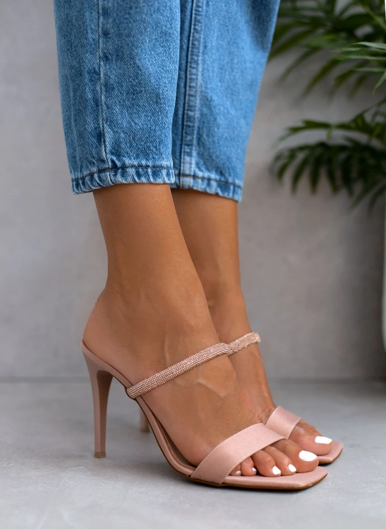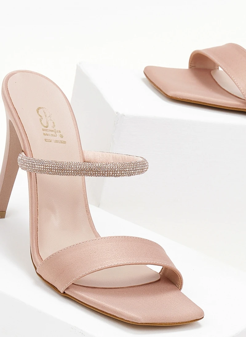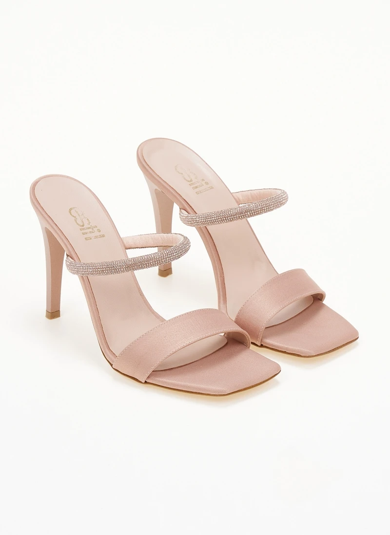 Πέδιλα σατέν με λεπτές φάσες και strass. Έχουν ψηλό λεπτό τακούνι. Καρέ γραμμη. Ελληνικής κατασκευής.