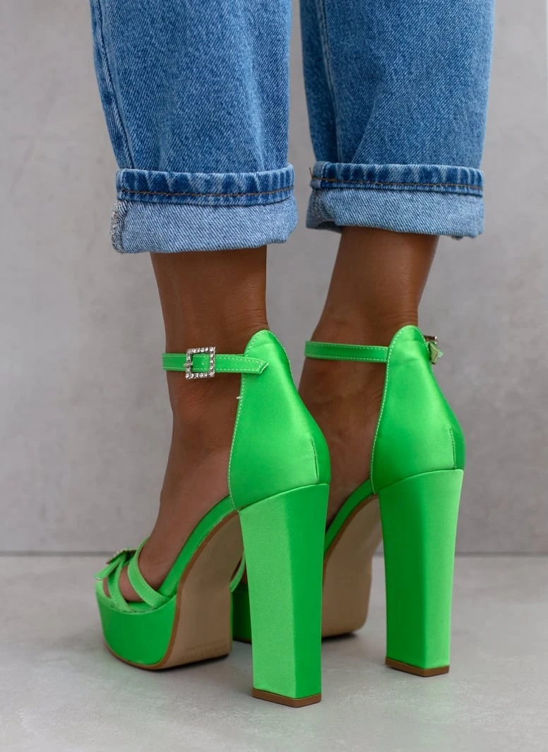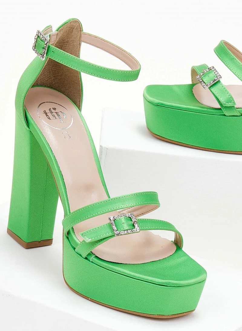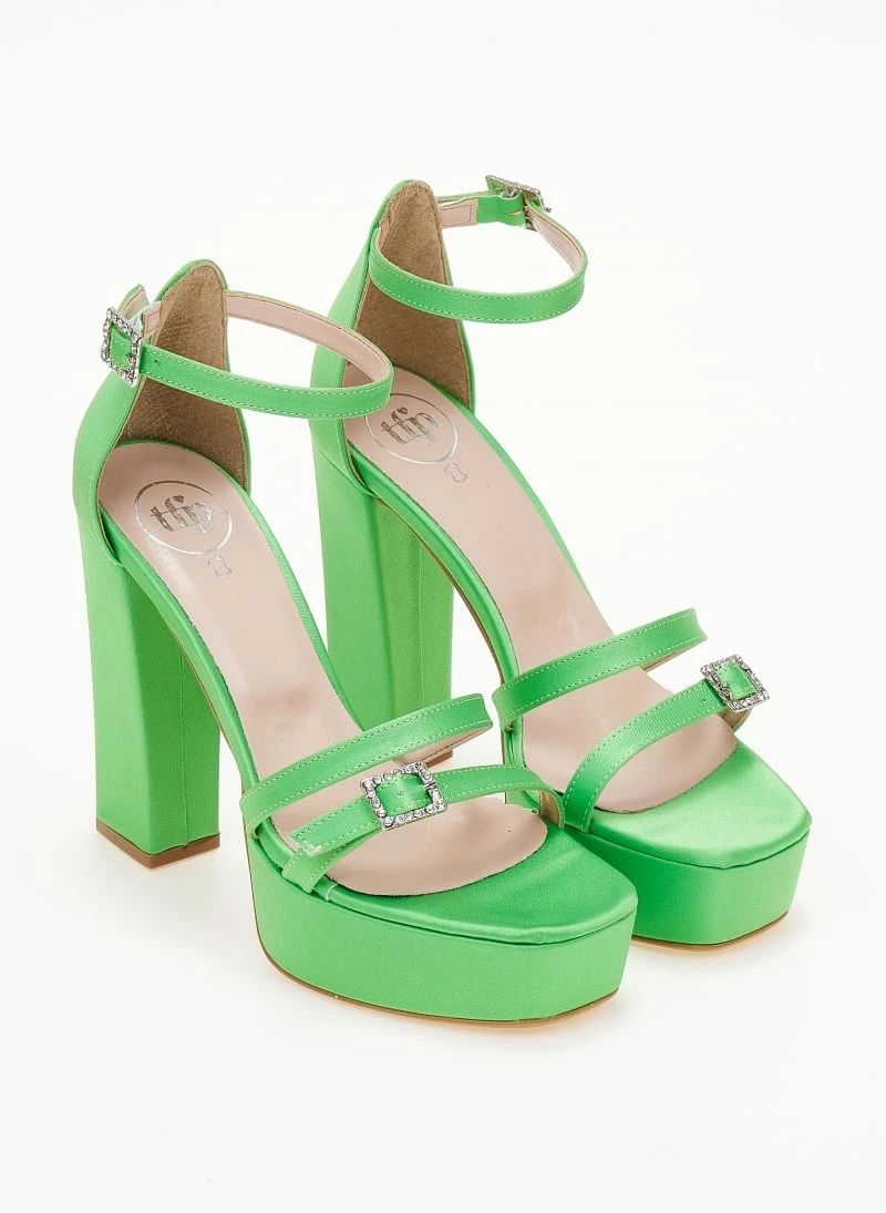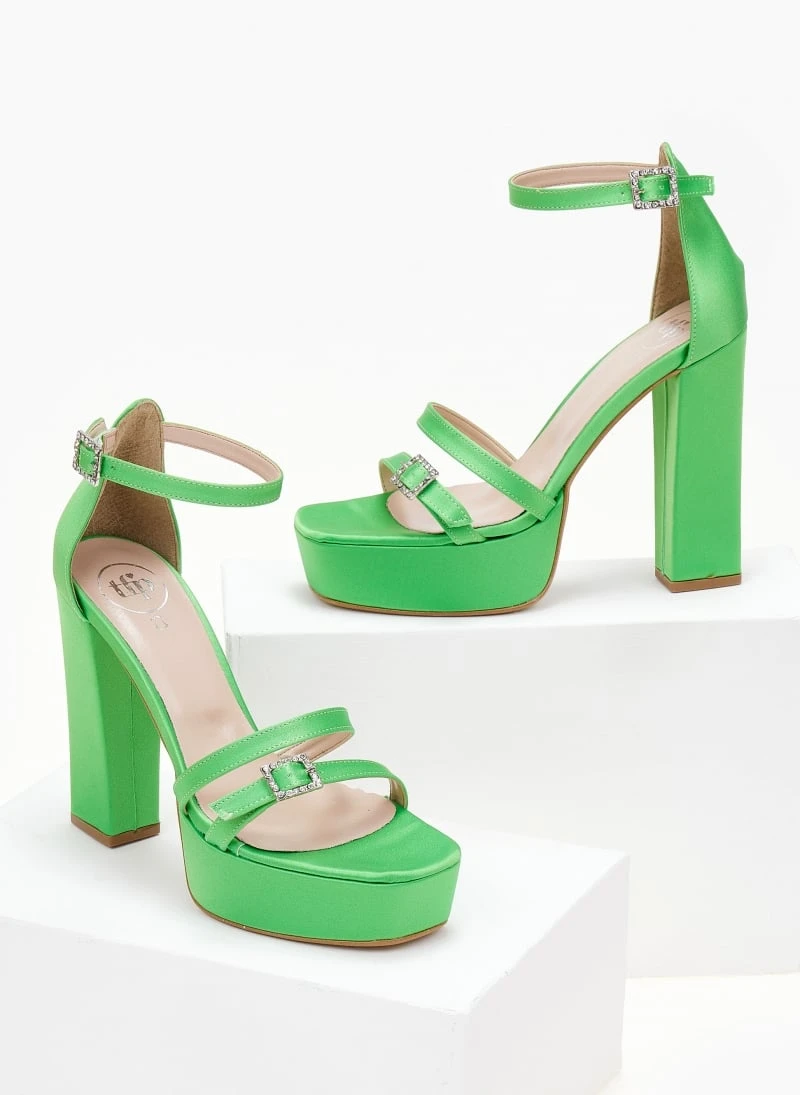 Πέδιλα με διπλό λουράκι και strass λεπτομέρεια. Έχουν φιάπα και ψηλό τακούνι. Η φτέρνα είναι κλειστή. Δένουν με μπαρέτα στο ύψος του αστραγάλου. Καρέ γραμμή. Δερμάτινος πάτος. Ελληνικής κατασκευής.