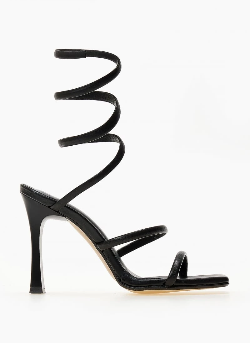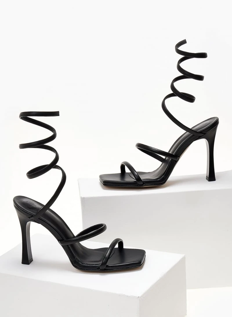 Πέδιλα TFP με λεπτά λουράκια με κρύσταλλα. Έλασμα σπιράλ στο ύψος της γάμπας. Έχουν λεπτό ψηλό τακούνι. Ελληνικής κατασκευής,χειροποίητα.