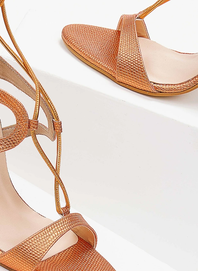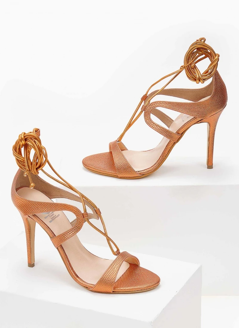Πέδιλα με δέσιμο στη γάμπα.Έχουν κλειστή φτέρνα και ψηλό τακούνι.Ελληνικής κατασκευής.