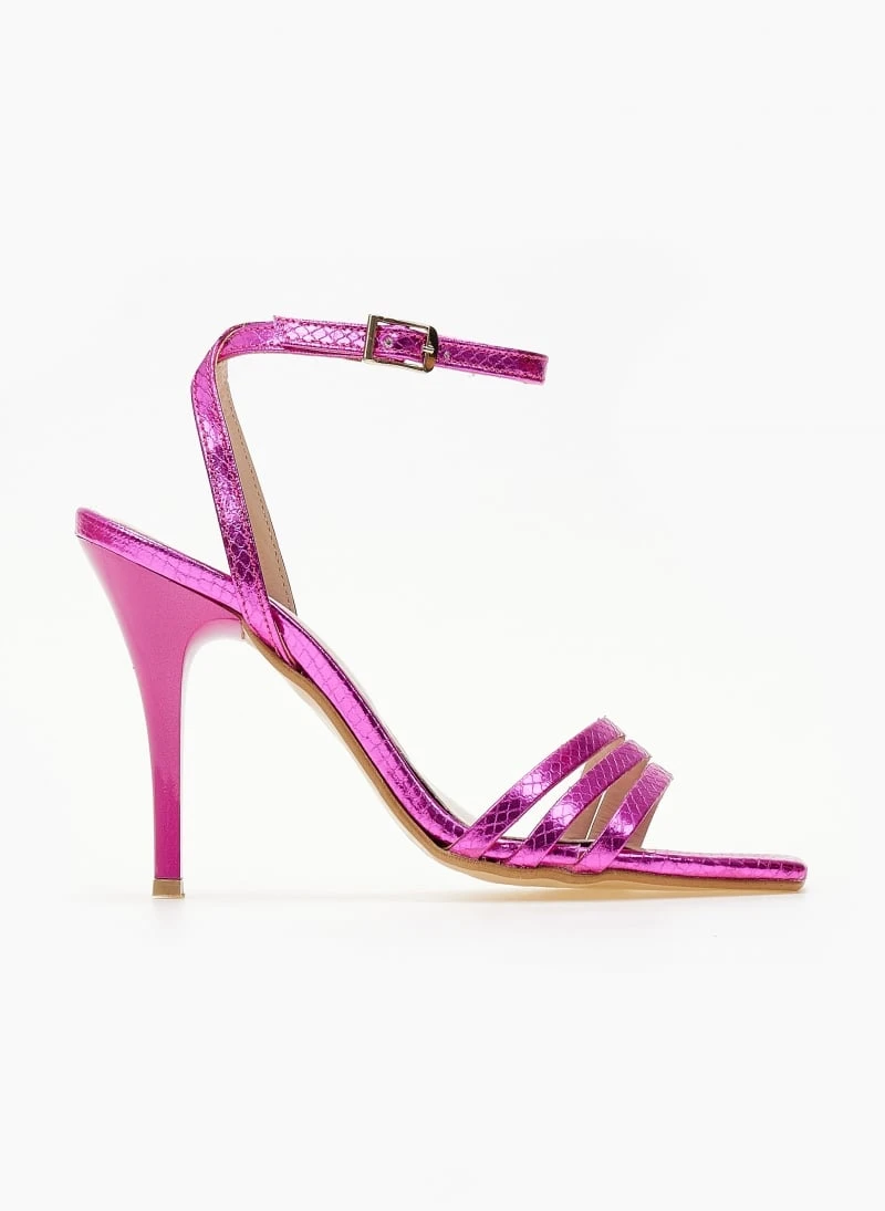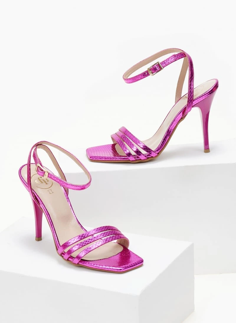 Πέδιλα TFP με λεπτά λουράκια και pattern φίδι. Δένουν με μπαρέτα στο ύψος του αστραγάλου. Έχουν λεπτό τακούνι. Καρέ γραμμή. Δερμάτινος πάτος. Ελληνικής κατασκευής.