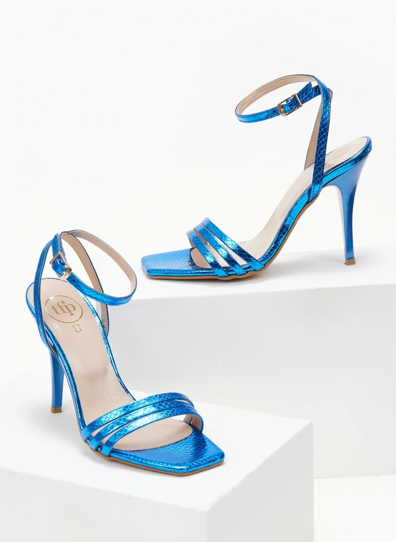 Πέδιλα TFP με λεπτά λουράκια και pattern φίδι. Δένουν με μπαρέτα στο ύψος του αστραγάλου. Έχουν λεπτό τακούνι. Καρέ γραμμή. Δερμάτινος πάτος. Ελληνικής κατασκευής.