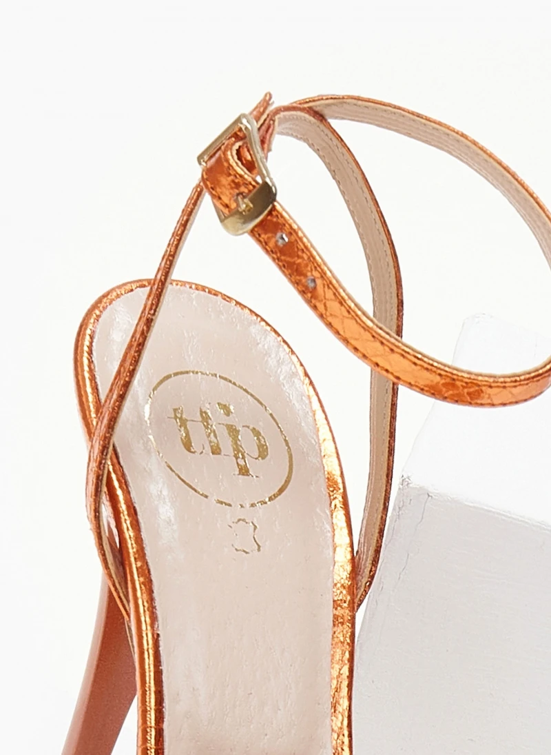 Πέδιλα TFP με λεπτά λουράκια και pattern φίδι. Δένουν με μπαρέτα στο ύψος του αστραγάλου. Έχουν λεπτό τακούνι. Καρέ γραμμή. Δερμάτινος πάτος. Ελληνικής κατασκευής.