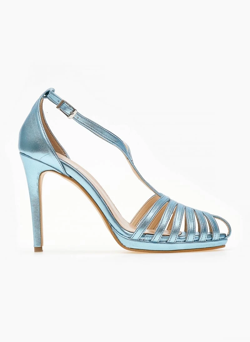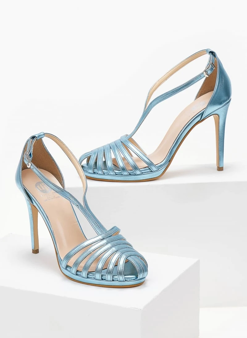 Ρετρό TFP πέδιλα σε μεταλλικές αποχρώσεις. Δένουν με λουράκια στο ύψος του αστραγάλου. Έχουν κλειστή φτέρνα και λεπτή φιάπα. Ελληνικής κατασκευής.