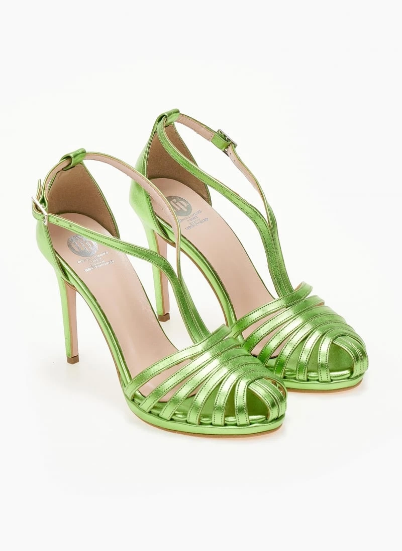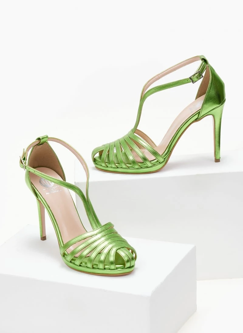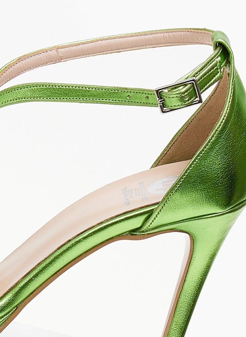 Ρετρό TFP πέδιλα σε μεταλλικές αποχρώσεις. Δένουν με λουράκια στο ύψος του αστραγάλου. Έχουν κλειστή φτέρνα και λεπτή φιάπα. Ελληνικής κατασκευής.