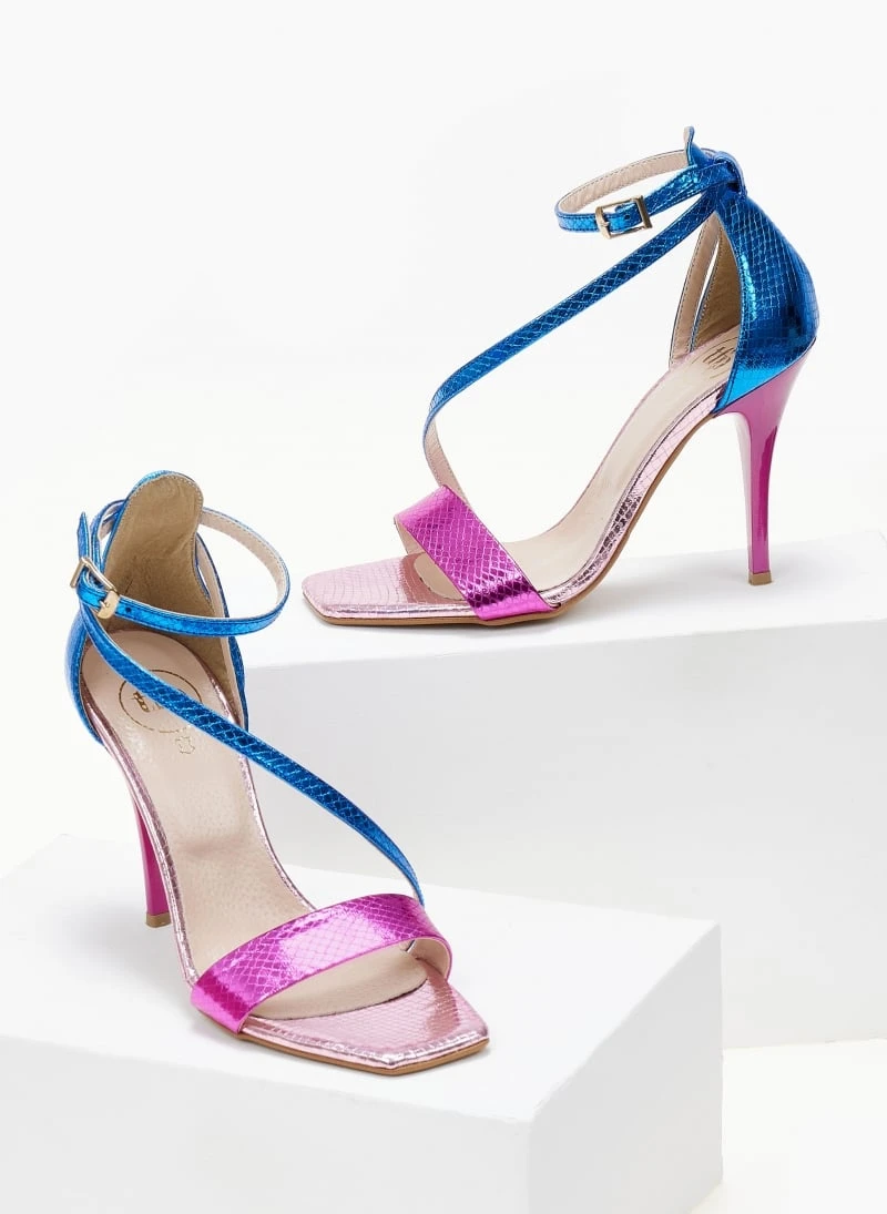 Πέδιλα μεταλλιζέ με pattern φίδι. Έχουν κλειστή φτέρνα. Λεπτό ψηλό τακούνι. Δερμάτινος πάτος. Ελληνικής κατασκευής.