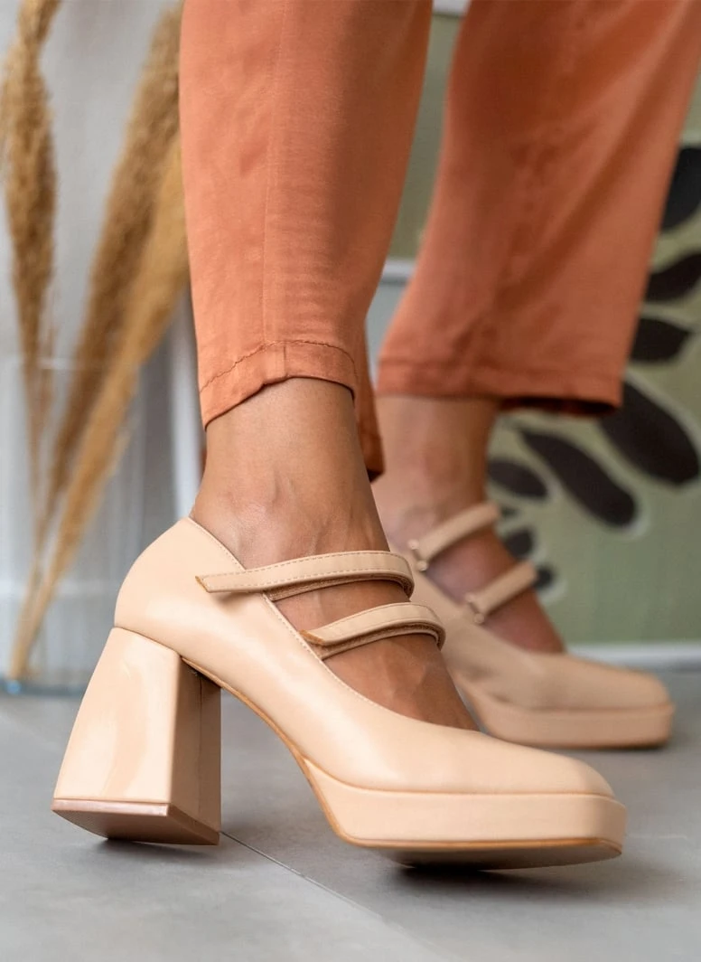 Γόβες Mary Janes σε καρε γραμμή. Κλείνουν με διπλή μπαρέτα στο ύψος του κουτεπιέ. Έχουν φιάπα και ιδιαίτερο φαρδύ τακούνι.