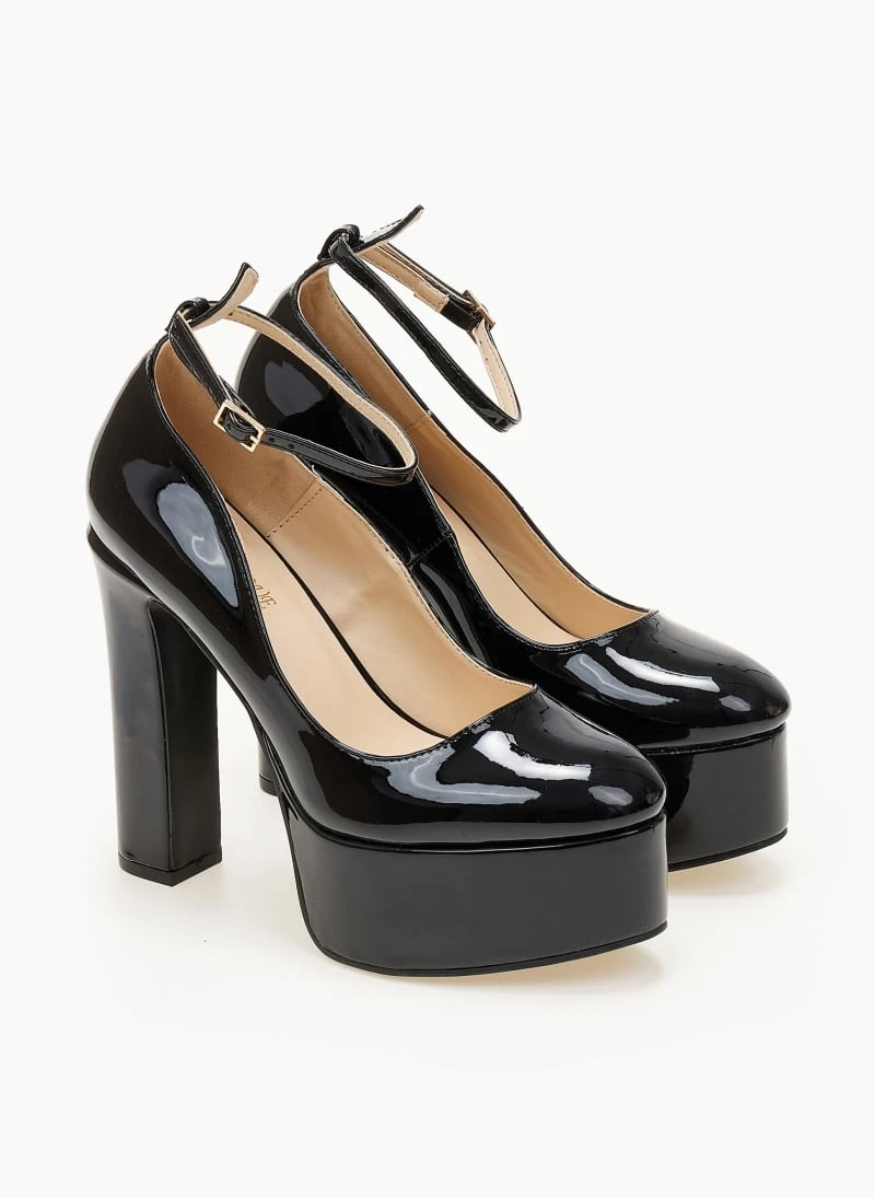Γόβες platform λουστρίνι. Έχουν ψηλή φιάπα με φαρδύ τακούνι. Δένουν με μπαρέτα στο ύψος του αστραγάλου. Στρογγυλή γραμμή.