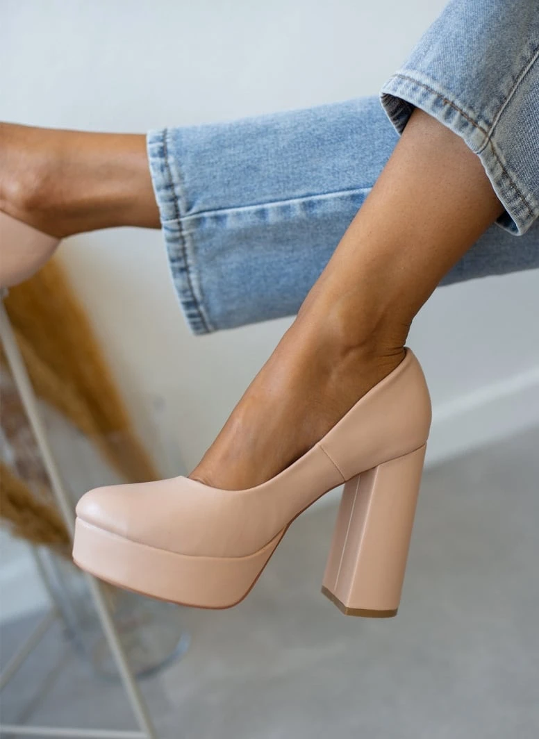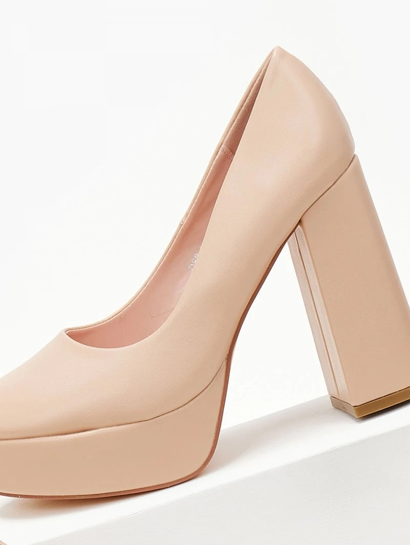 Γόβες σε στρογγυλή γραμμή με ψηλή φιάπα. Έχουν ψηλό τετράγωνο τακούνι.