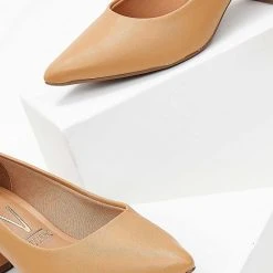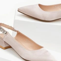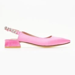 Γόβες μυτερές σατέν με μικρά strass. Έχουν λεπτό ψηλό τακούνι. Ανοιχτή φτέρνα. Δένουν με λουράκι στο πλάι.