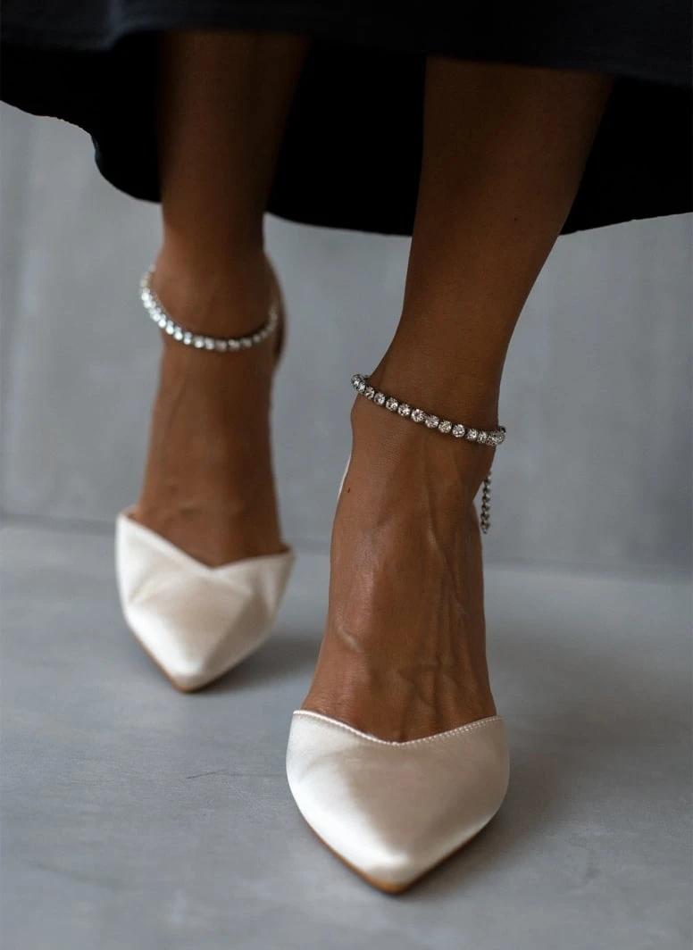 Γόβες ανοιχτές σατέν με λεπτό ψηλό τακούνι. Έχουν anklet με strass στο ύψος του αστραγάλου. Μυτερή φόρμα.