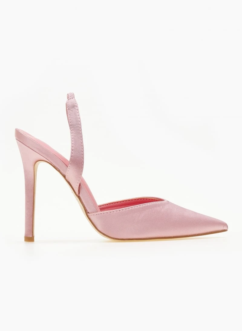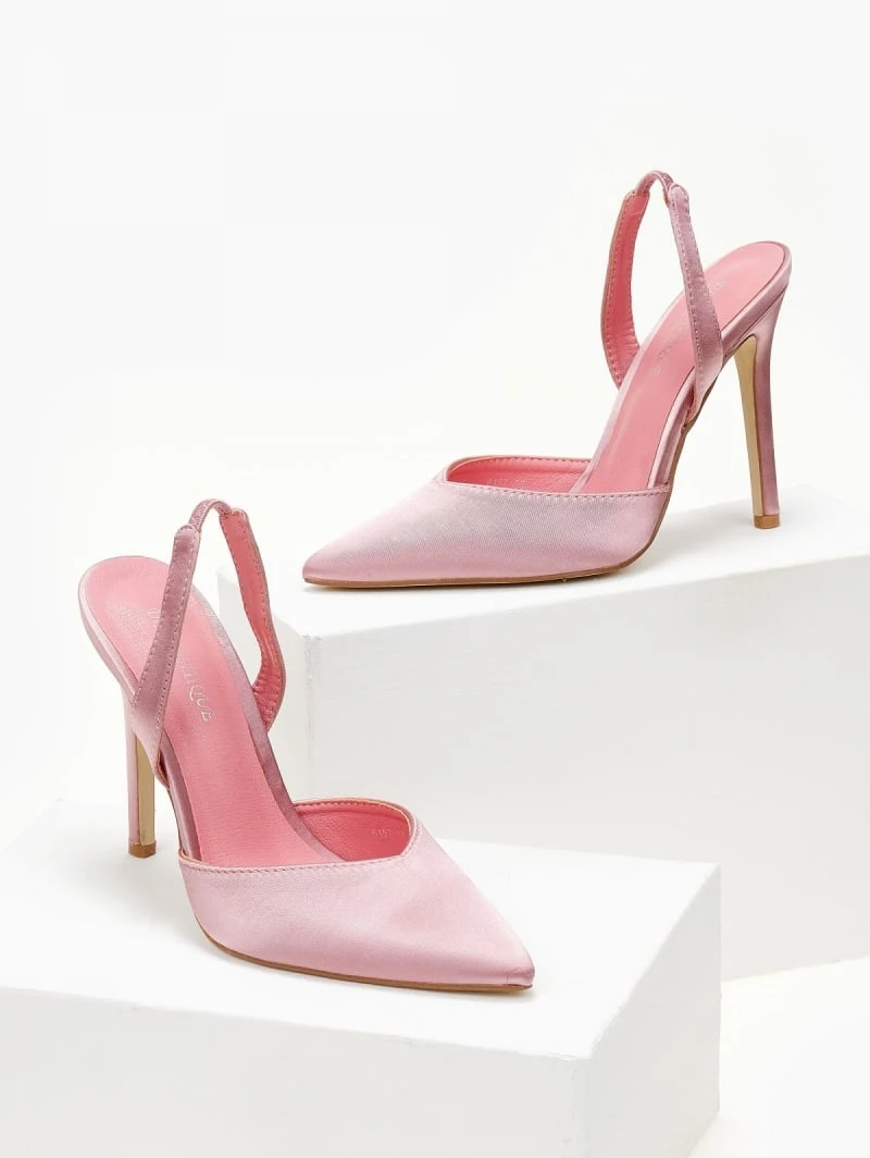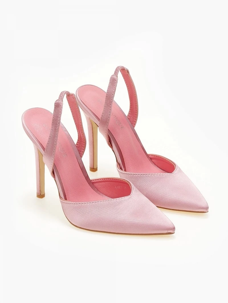 Γόβες σατέν μυτερές. Έχουν ανοιχτή φτέρνα και λουράκι με διακριτικό λάστιχο. Ψηλό λεπτό τακούνι.