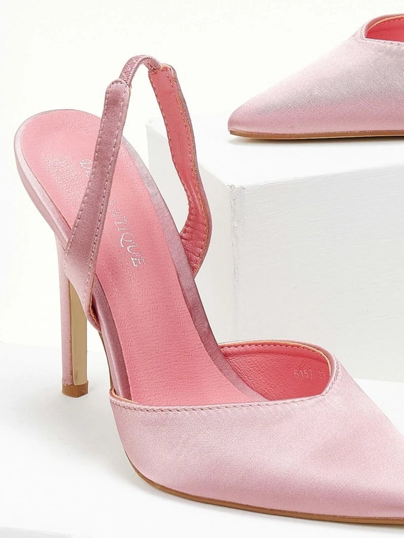 Γόβες σατέν μυτερές. Έχουν ανοιχτή φτέρνα και λουράκι με διακριτικό λάστιχο. Ψηλό λεπτό τακούνι.
