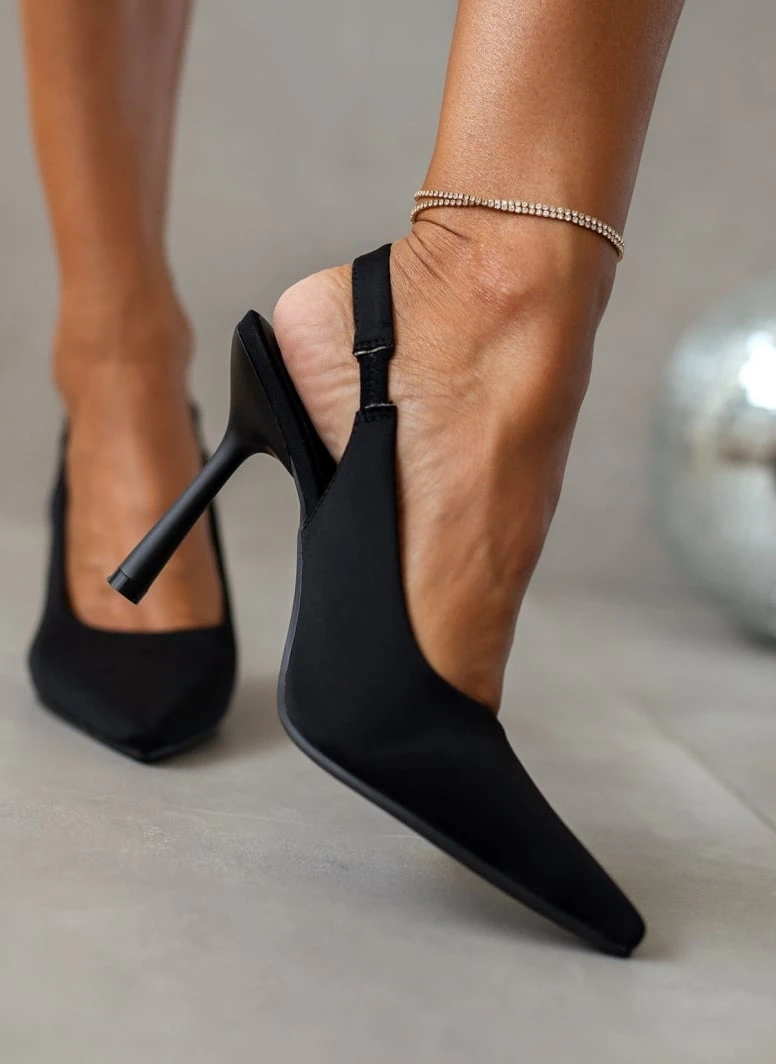Γόβες σατέν με ανοιχτή φτέρνα. Έχουν διακριτικό λάστιχο στην εσωτερική τους πλευρά για καλύτερη εφαρμογή. Μυτερή φόρμα.