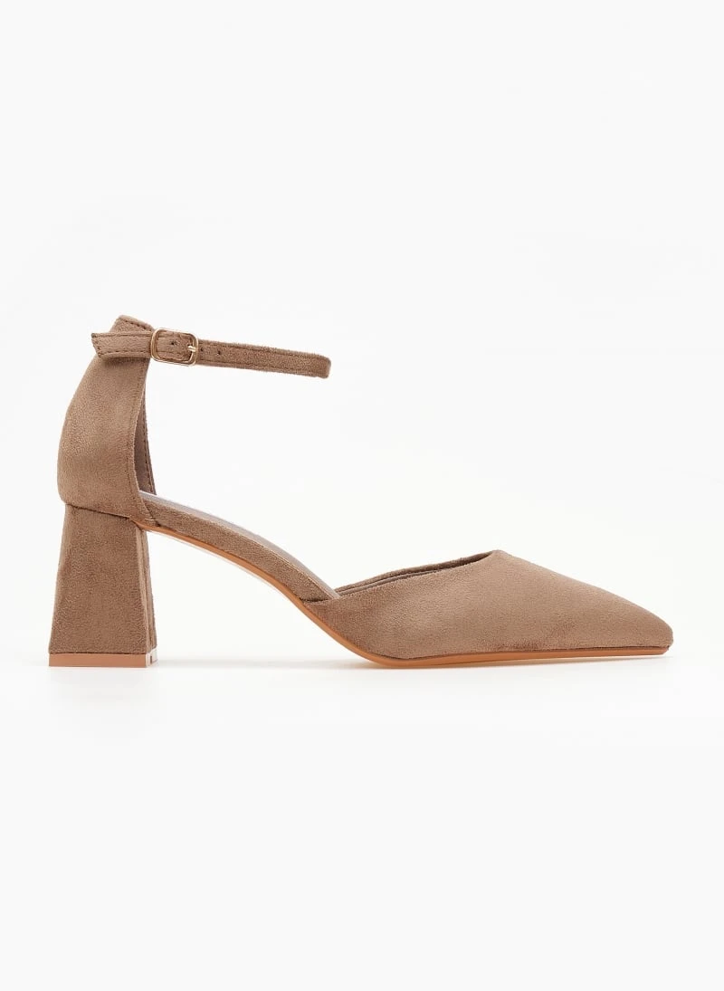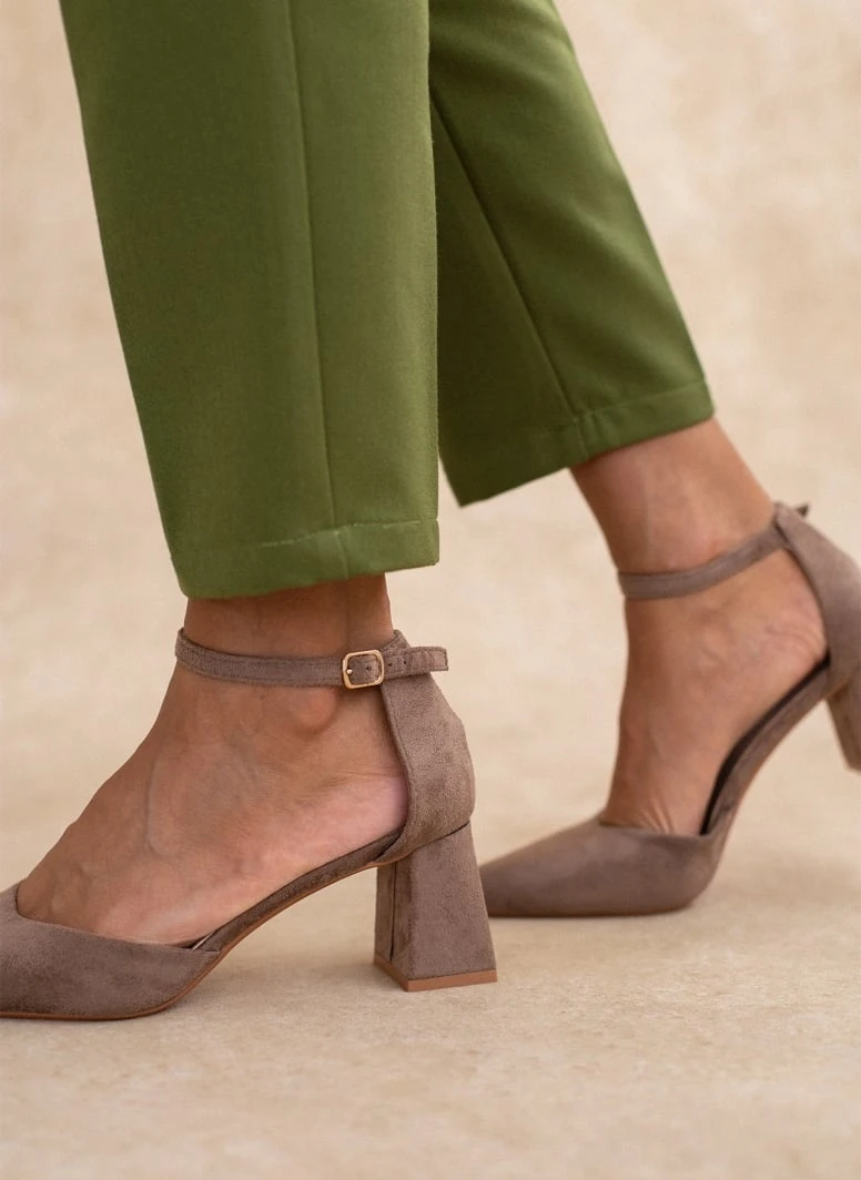 Γόβες μυτερές suede με ανοιχτά πλαΙνά. Έχουν κλειστή φτέρνα. Δένουν με μπαρέτα στο ύψος του αστραγάλου. Χαμηλό χοντρό τακούνι.
