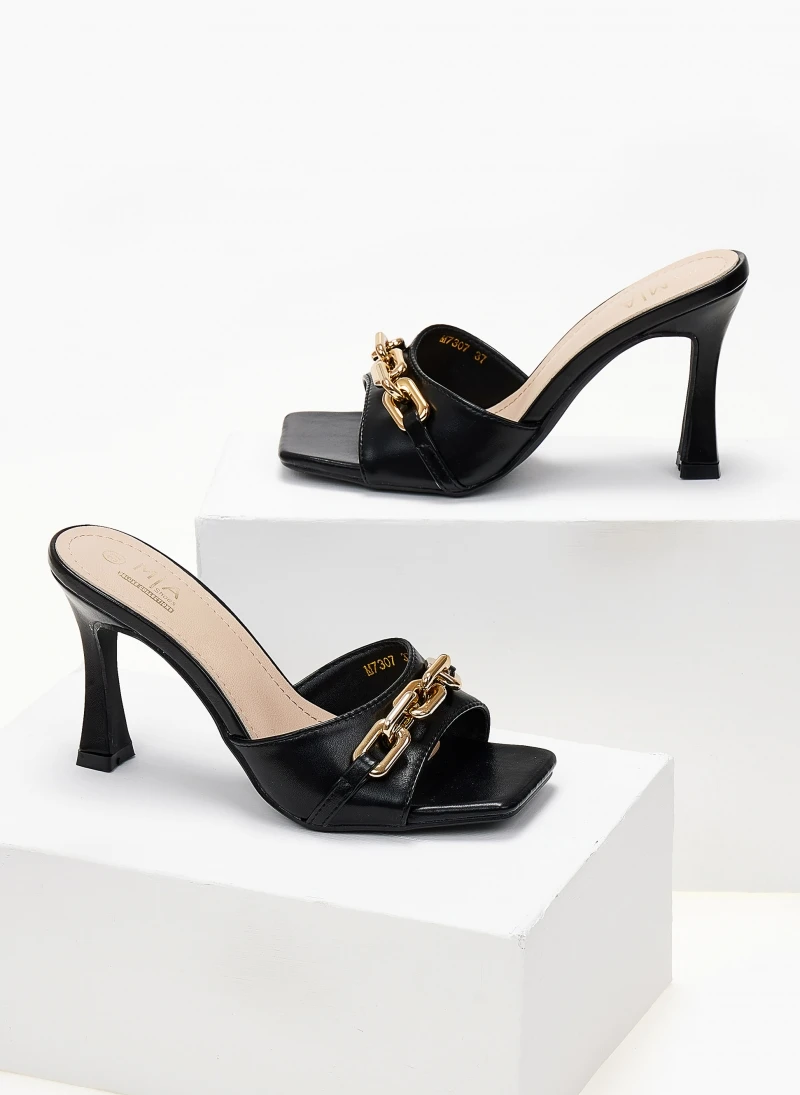 Mules με αλυσίδα στη φάσα. Καρέ γραμμή. Λεπτό ψηλό τακούνι.