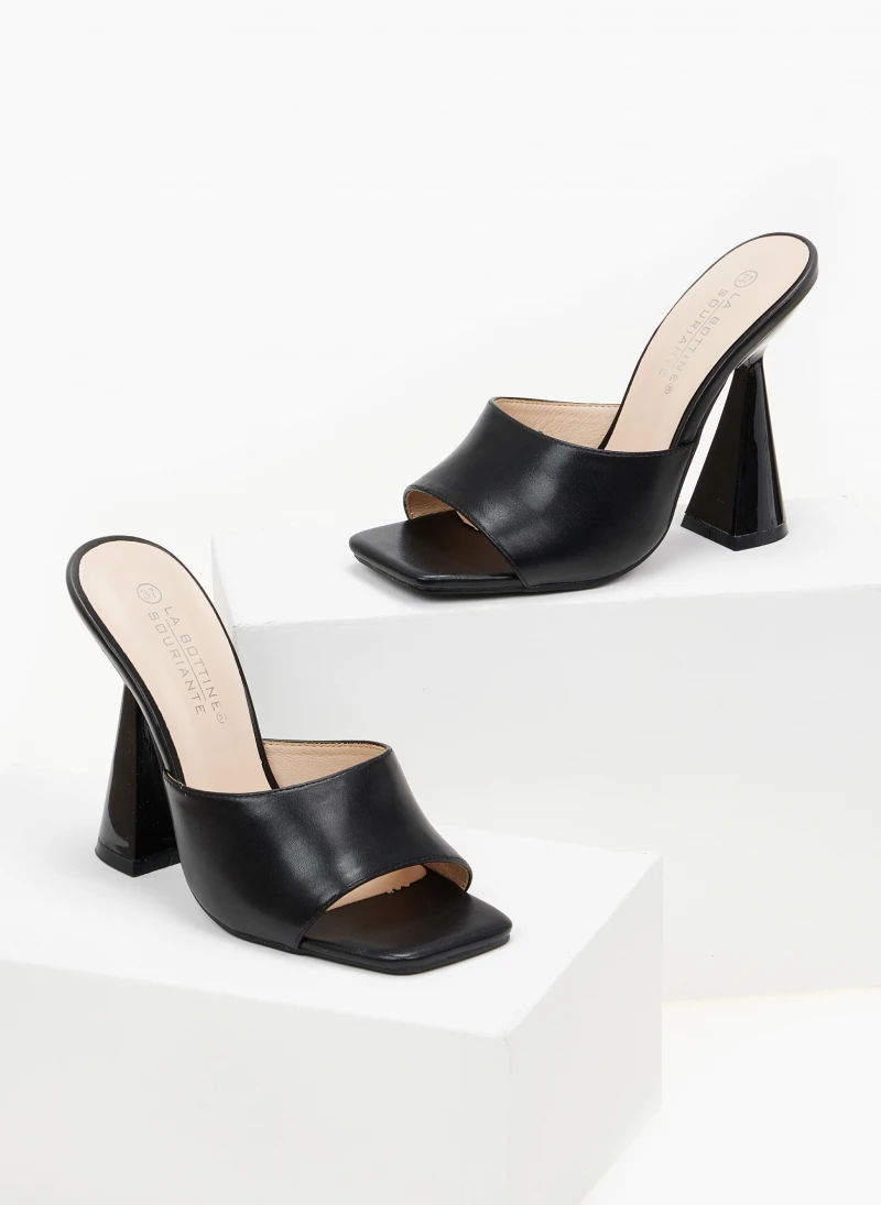 Mules σε καρέ γραμμή με φαρδιά φάσα.Έχουν ψηλό γυαλιστερό τακούνι καμπάνα.