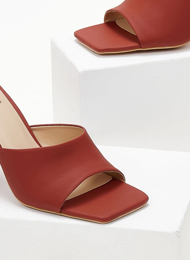 Mules σε ματ χρώματα με ψηλό ιδιαίτερο τακούνι. Έχουν φαρδιά φάσα. Καρέ γραμμή.