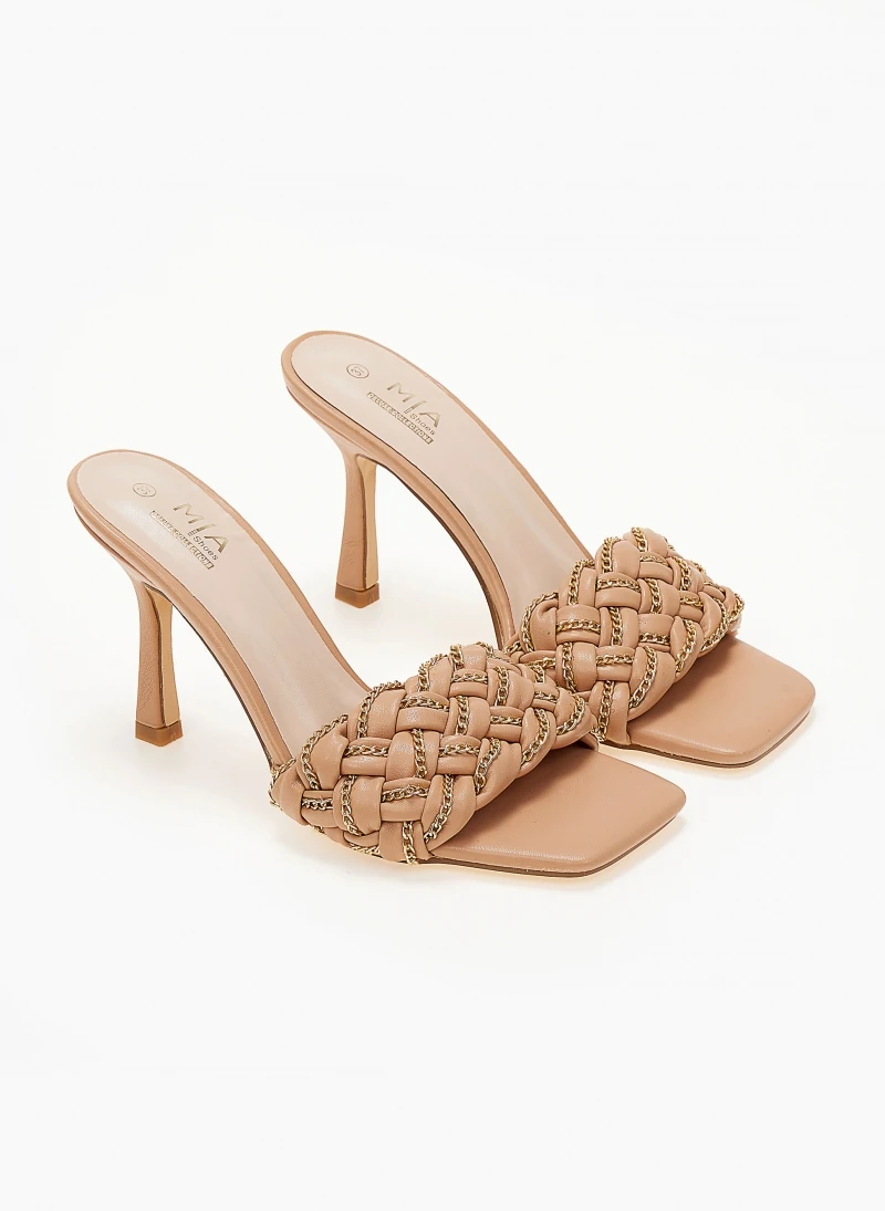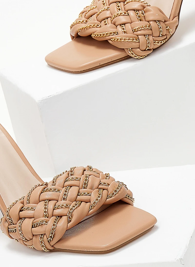 Mules με πλεκτό σχέδιο στη φάσα. Έχουν λεπτομέρεια λεπτή περαστή αλυσίδα. Ψηλό λεπτό τακούνι.. Καρέ γραμμή.