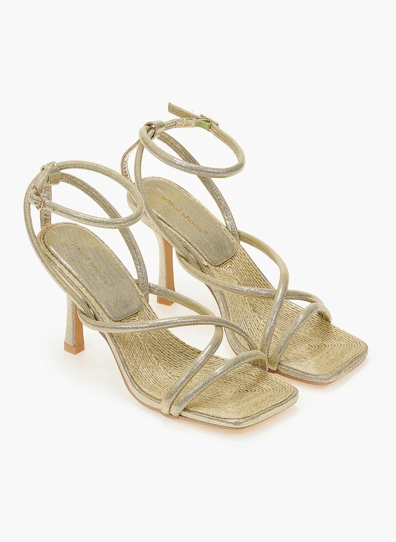 Πέδιλα με glitter στρογγυλά λουράκια.Έχουν σχέδιο με σχοινί στον πάτο.Δένουν με μπαρέτα στο ύψος του αστραγάλου.Καρέ γραμμή.