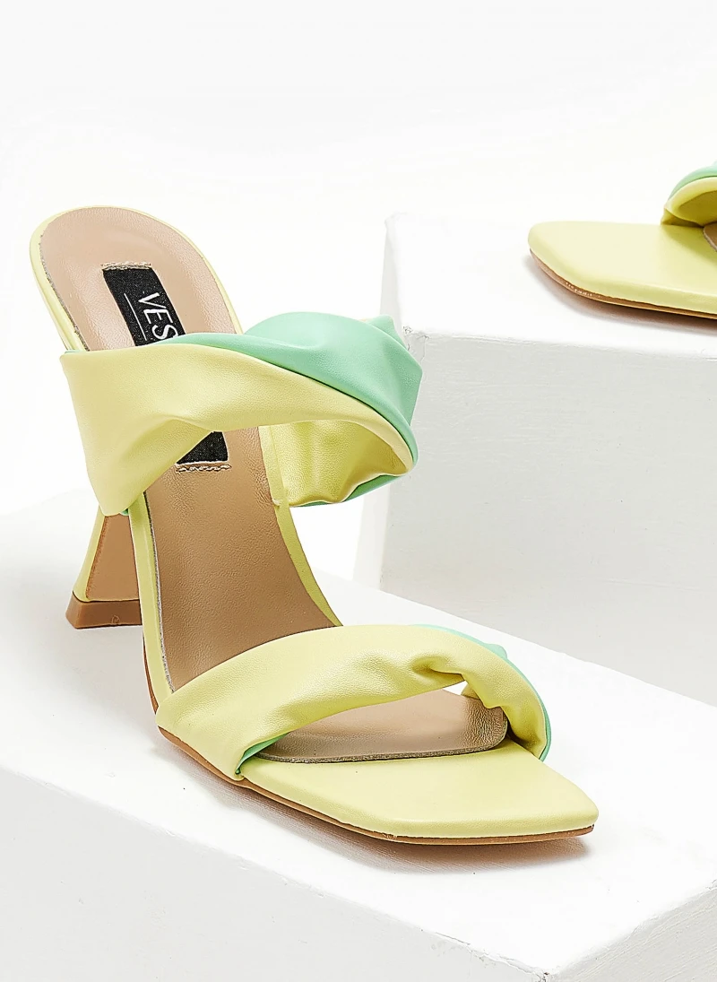 Πέδιλα με ψηλό λεπτό τακούνι. Έχουν στριφτές φάσες σε συνδυασμούς χρωμάτων. Καρέ γραμμή.