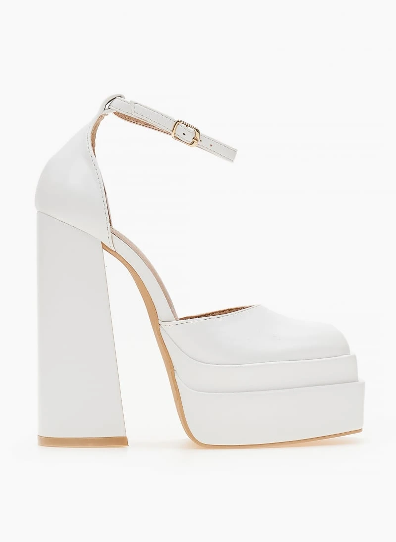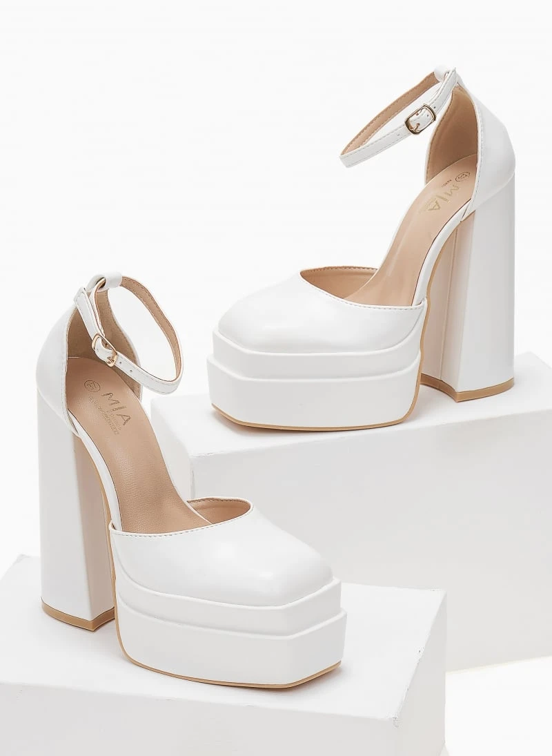 Πέδιλα με διπλή φιάπα. Έχουν κλειστή φτέρνα. Δένουν με μπαρέτα στο ύψος του αστραγάλου. Ψηλό τετράγωνο τακούνι. Καρέ γραμμή.