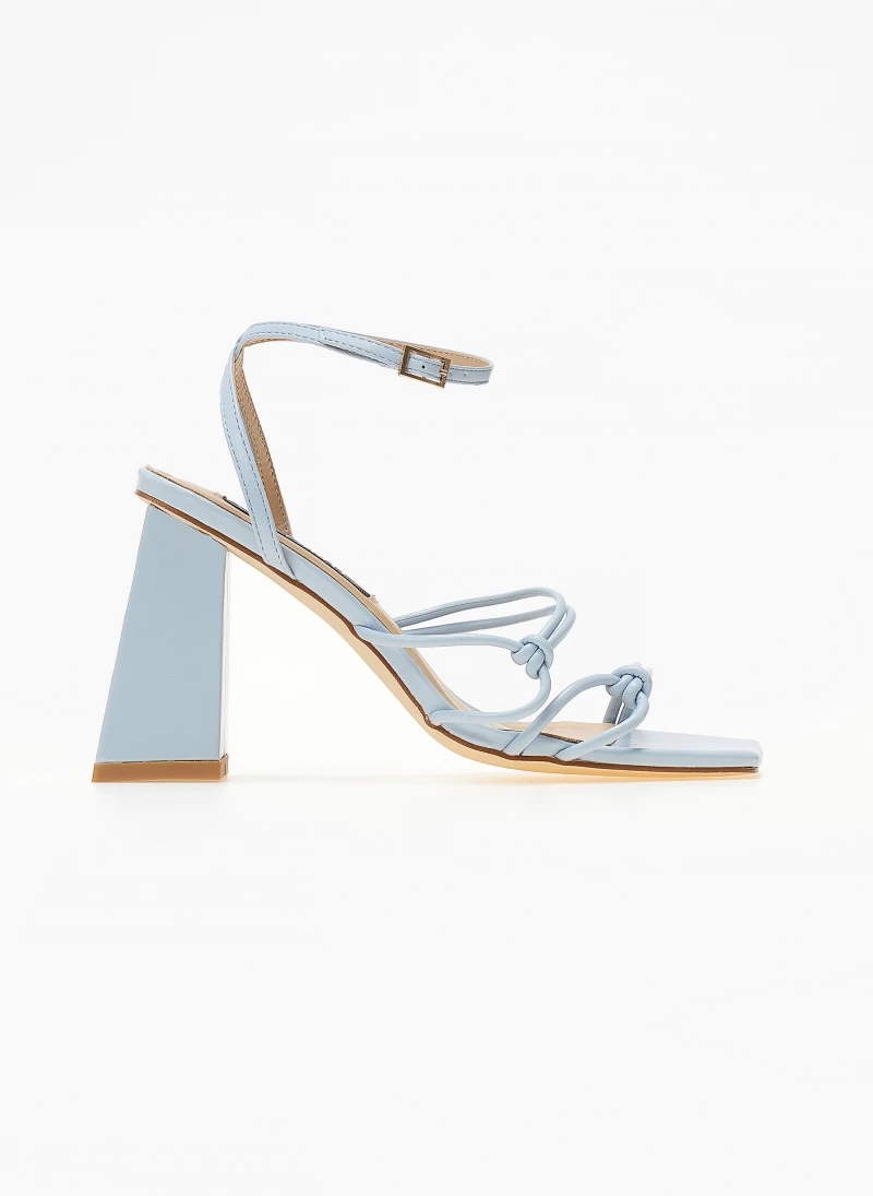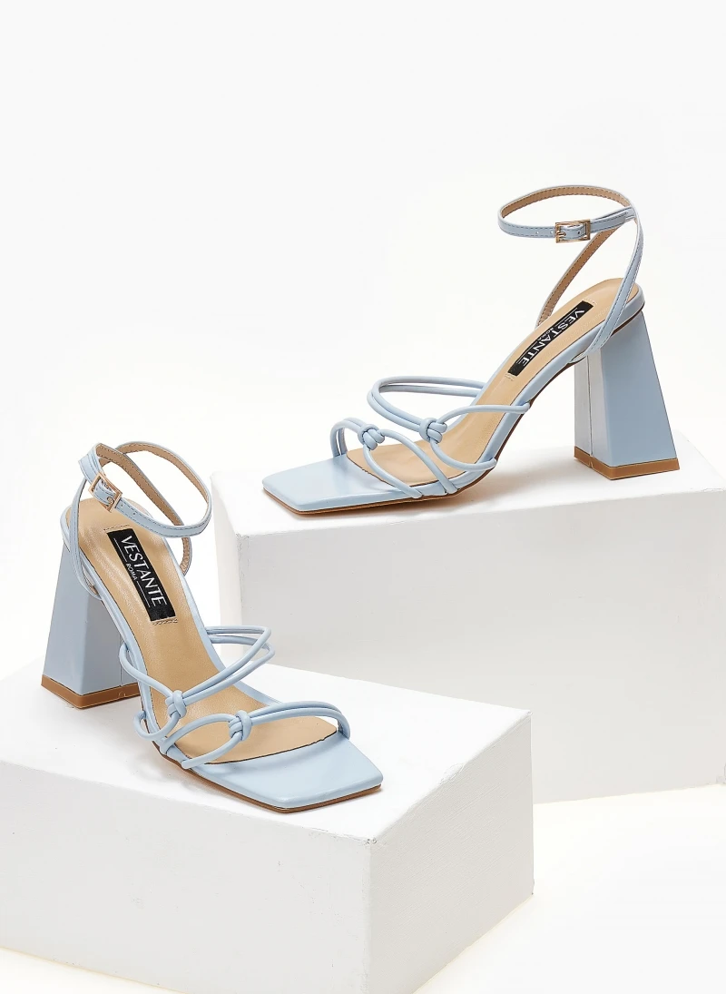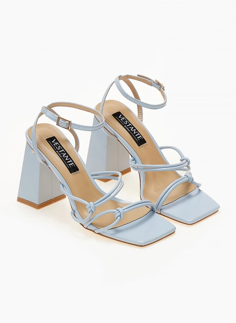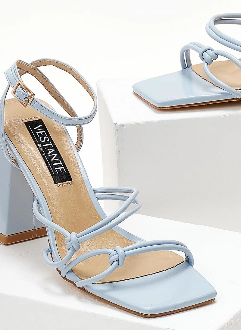 Πέδιλα με λεπτά λουράκια και σχέδιο κόμπους στο πλάι. Δένουν με μπαρέτα στο ύψος του αστραγάλου. Έχουν ιδιαίτερο χοντρό τακούνι. Καρέ γραμμή.