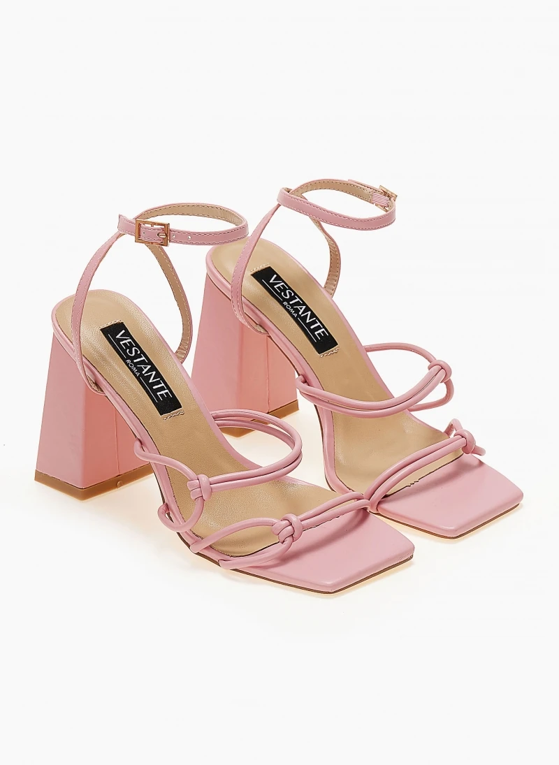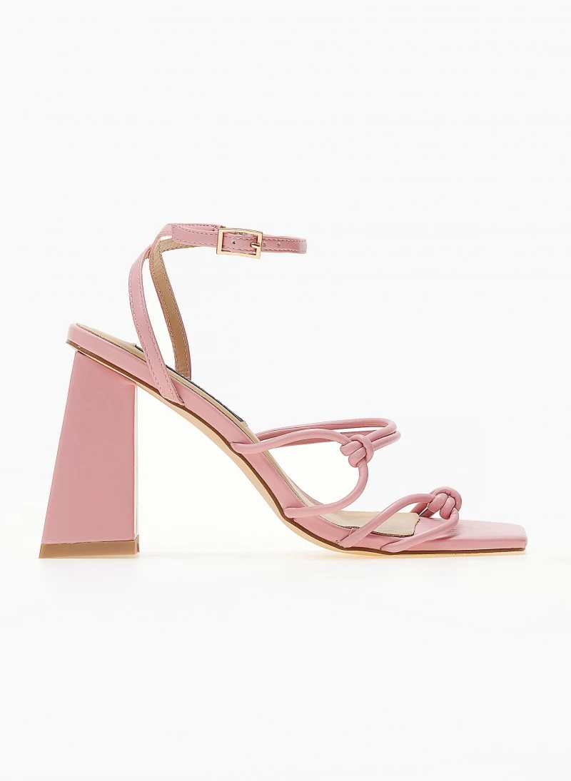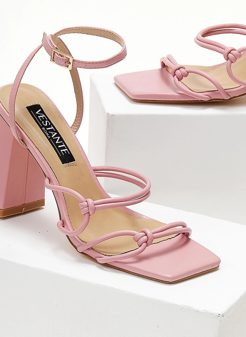 Πέδιλα με λεπτά λουράκια και σχέδιο κόμπους στο πλάι. Δένουν με μπαρέτα στο ύψος του αστραγάλου. Έχουν ιδιαίτερο χοντρό τακούνι. Καρέ γραμμή.