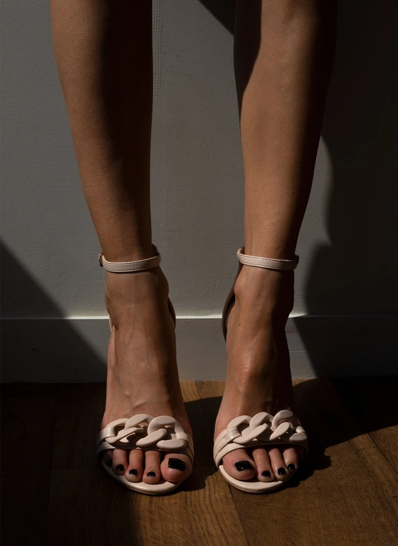 Πέδιλα με ψηλό τετράγνο τακούνι.Έχουν φάσα με ματ αλυσίδα στο ίδιο χρώμα.Κλειστή φτέρνα.Δένουν με μπαρέτα στο ύψος του αστραγάλου.