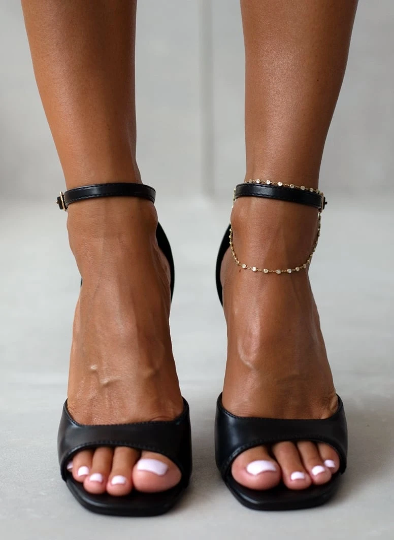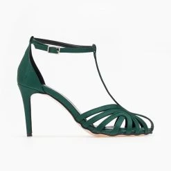 Πέδιλα με κλειστή φτέρνα. Δένουν με μπαρέτα στο ύψος του αστραγάλου. Καρέ γραμμή.
