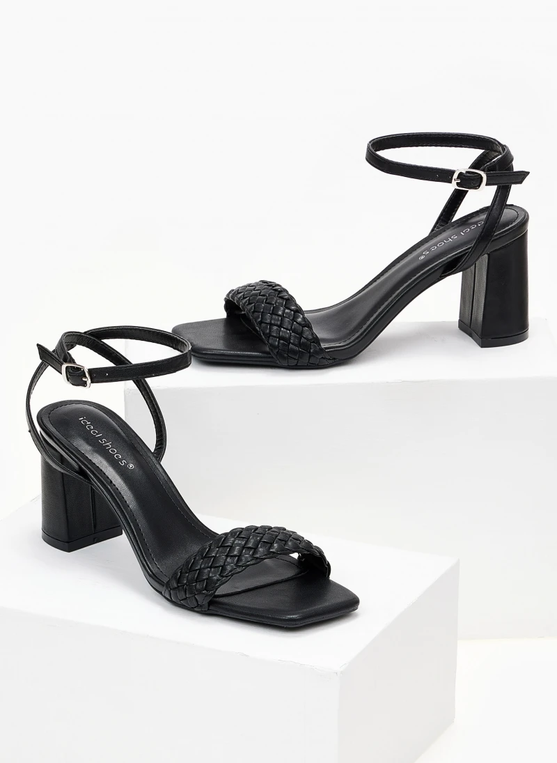 Πέδιλα σε καρέ γραμμή με πλεκτό σχέδιο στη φάσα.Έχουν φαρδύ τακούνι.Δένουν με μπαρέτα στο ύψος του αστραγάλου.