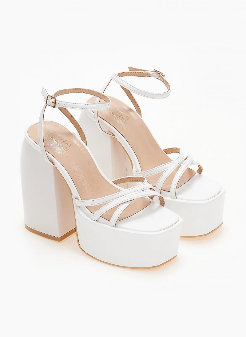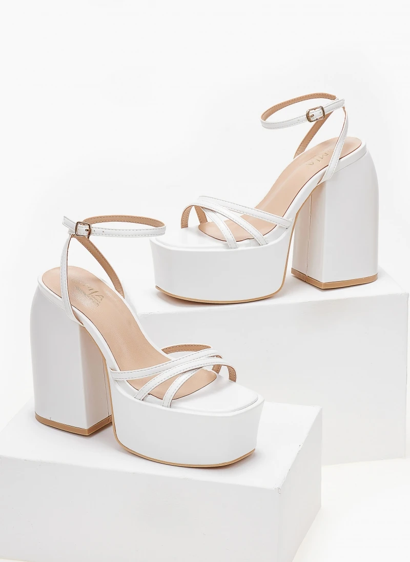 Πέδιλα platform με μπαρέτα και λουράκια χιαστί. Έχουν ψηλή φιάπα. Χοντρό τακούνι με ιδιαίτερο σχήμα.