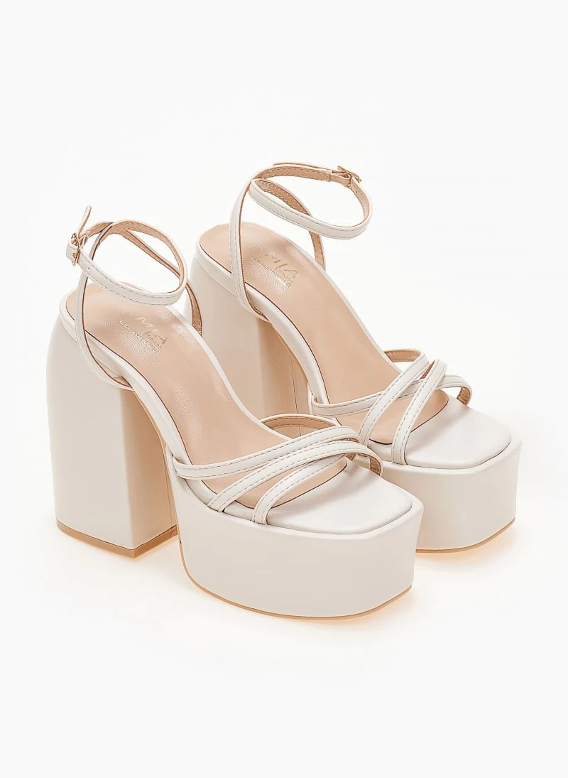 Πέδιλα platform με μπαρέτα και λουράκια χιαστί. Έχουν ψηλή φιάπα. Χοντρό τακούνι με ιδιαίτερο σχήμα.